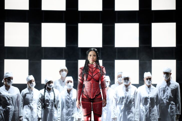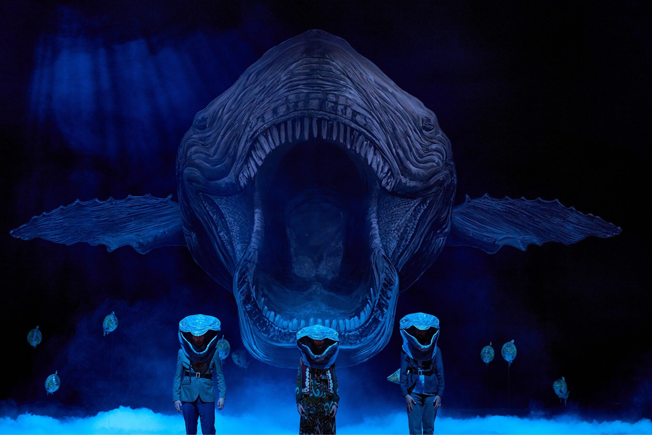 Stuttgart. Opernhaus. 22-VI-2025. Vivan et Ketan Bhatti : Der Rote Wal (La Baleine rouge), livret de Markus Winter d’après une histoire de Markus Winter et Martin G. Berger. Mise en scène : Martin G. Berger ; décor : Sarah-Katharina Karl ; costumes : Alexander Djurkov Hotter. Avec : Madina Frey (Gladis), Matthias Klink (Abad), Josefin Feiler (Ge), Maeckes (Lone), Deborah Saffery, Jasper Leever, Yunus Schahinger (Leviathan 1/2/3), Baron (Pip). Staatsorchester Stuttgart, Staatsopernchor Stuttgart ; direction : Marit Strindlund