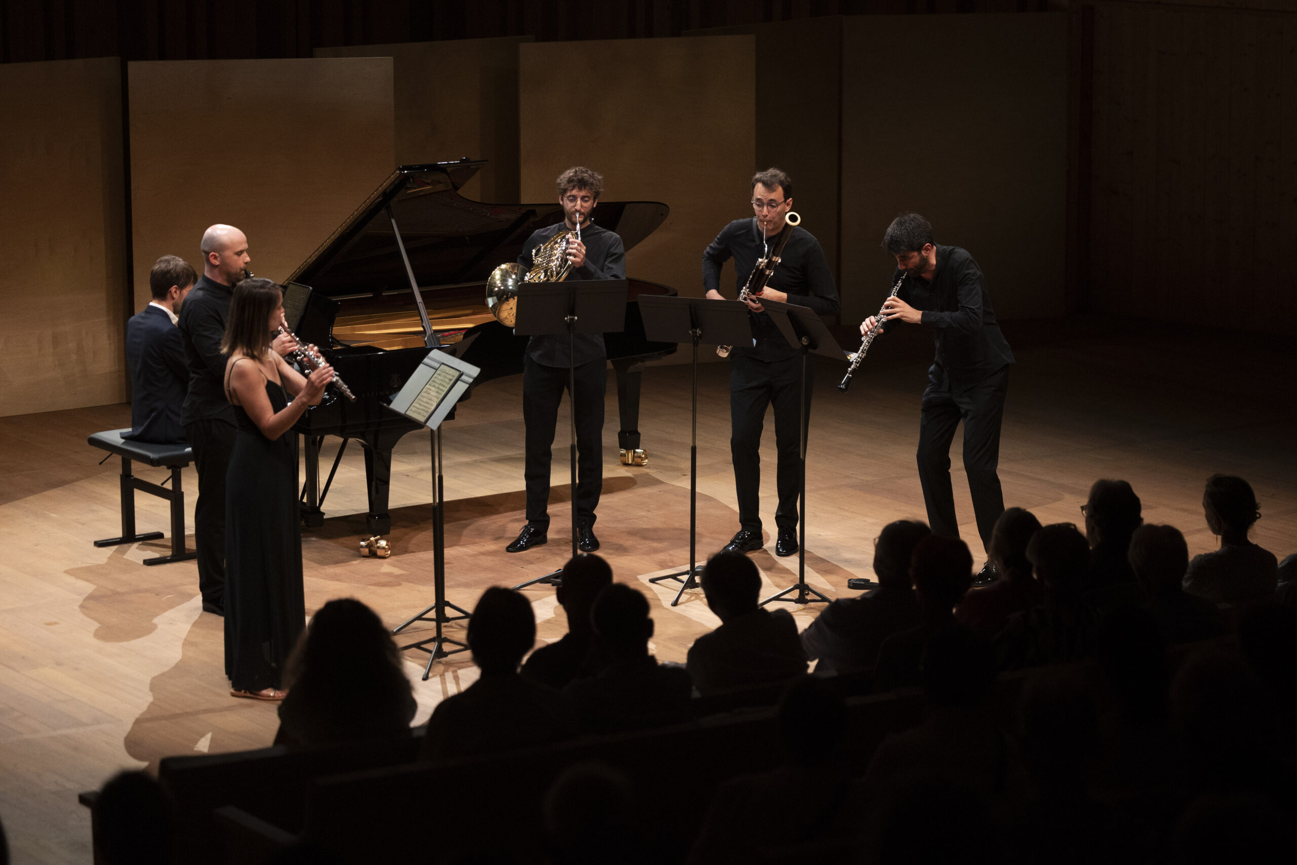 Juste après le déjeuner, c'est le pianiste Guillaume Bellom qu'on retrouve devant le Steinway, en compagnie de cinq musiciens de l'Ensemble Astera. Uniquement à vent, cet ensemble présente ici les sonates de Poulenc, dont on regrette d'ailleurs de ne pas avoir eu celle pour hautbois plutôt que le Trio pour hautbois, basson et piano. Pour ouvrir le programme, on commence par le meilleur de Poulenc avec la Sonate pour flûte et piano et ses fugaces réminiscence de thèmes du Dialogue des Carmélites, notamment au second mouvement. Coline Richard est à la flûte, et elle emporte la partition par ses couleurs et sa pureté. Juste après, elle laisse la place à Moritz Roelcke, lui aussi limpide pour délivrer avec son instrument tous les thèmes de la Sonate pour clarinette et piano. Guillaume Bellom n'a pas le même jeu que Hinnewinkel le matin et les partitions ne le demandent pas non plus. Il se montre donc plus léger et plus coloré, parfait pour accompagner sans les couvrir les musiciens, dont on découvre le basson de Jeremy Bager et le hautbois de Yann Thenet au trio, puis encore le cor de Gabriel Potier pendant le sextuor.