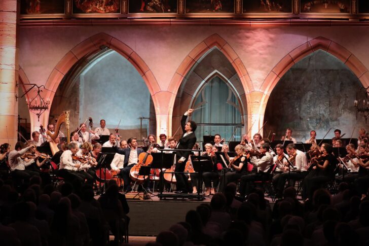 Ce n'était pas un choix de facilité, que d'ouvrir le Festival avec une œuvre datant de 2023. Mais la magie du lieu (cet extraordinaire temple protestant Saint-Matthieu, ses piliers gothiques, ses vitraux, sculptures, fresques et peintures…), la communication spontanée et sympathique du chef avec le public, l'engagement total des musiciens, orchestre et soliste, sous la baguette de leur chef charismatique ont porté ces Chants de l'Aube de , étrennés quelques semaines auparavant à Francfort au cours du même concert, à un incontestable succès. L'écriture de ce Deuxième concerto pour violoncelle de est d'une beauté presque suffocante. Dès les premières mesures, les frissons du violoncelle, les échos délicats d'une cloche et la montée en puissance des graves de la pâte orchestrale sont un enchantement. Les rais de lumière, les miroitements délicats, les jeux de couleurs sont magnifiques. Le dialogue avec le xylophone et les cadences pour violoncelle mènent à une émotion indicible. C'est, bien plus qu'une aube ou qu'une évolution intérieure, une sorte de fusion entre lumière et matière qui est exposée, et qui procure une ivresse dont on ne sait plus si elle est acoustique ou visuelle. , dédicataire, créateur, interprète inspiré et quasi-démiurgique de l'œuvre a bien raison de faire acclamer la partition : il s'agit de toute évidence d'une œuvre majeure du XXIe siècle. Après ce concerto extrêmement virtuose, totalement maîtrisé, il donne en bis Après un rêve de Fauré, et c'est un autre bonheur d'entendre un chant de violoncelle au phrasé aussi impeccable.