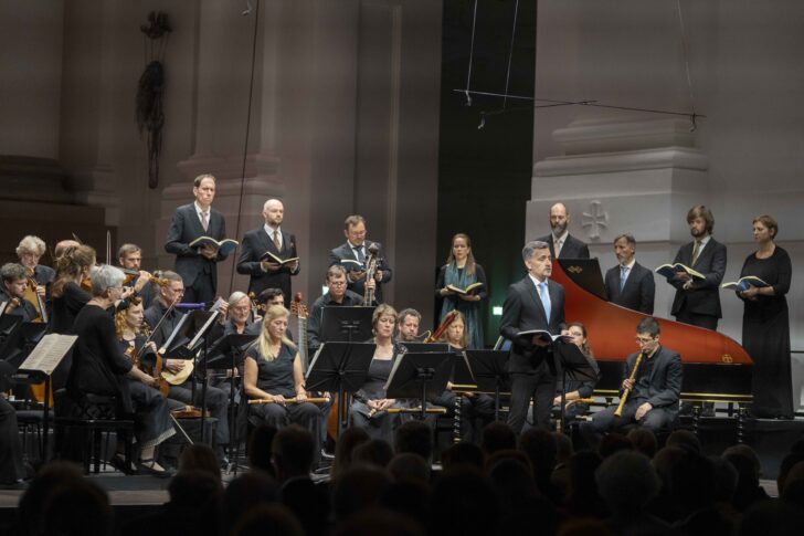 Vox Luminis, déjà invité dans ce cadre en 2023 et 2024, revient en 2025 avec deux programmes. Deux jours avant cette Passion, on a pu admirer un programme d'oratorios de Carissimi et Charpentier qui a justement enthousiasmé le public salzbourgeois. Le second programme, lui, n'est pas une rareté, même si la Passion selon saint Jean n'avait figuré qu'une seule fois au programme du festival, en 1989. Vox Luminis n'en est pas à son coup d'essai avec la Passion selon saint Jean. En 2019, Lionel Meunier avait collaboré avec Café Zimmermann ; cette fois, c'est le tour du Freiburger Barockorchester, sous la conduite de Petra Müllejans au premier violon, continuant une collaboration au long cours.