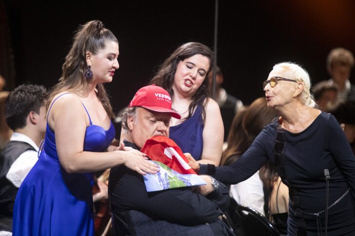 Les lumières s'abaissent. Les musiciens de l'orchestre cessent leur petit commerce de répétition d'un trait, d'une phrase, d'une triple croche de dernière révision. Le silence se fait dans la salle. Sous les applaudissements conventionnels et polis du public, les premiers protagonistes entrent en scène et se placent en rang d'oignons sur le devant de la scène. Ils sont là, têtes baissées, mines renfrognées. Étrange attitude pour des artistes qui vont chanter un opéra. Auraient-ils été semoncés avant d'entrer en scène ? Aurait-on rabattu leur cachet ? Même le chef Andrea Battistoni jette un regard étonné à ses chanteurs. Ces boudeurs sont les familiaux du riche Buoso Donati qui vient de mourir léguant toute sa fortune aux moines. Désespérés, il font appel à l'astucieux Gianni Schicchi qui se proposera de prendre la place du défunt, dont la ville ignore encore la mort, pour demander au notaire d'annuler tous les précédents testaments. Et de dicter un nouvel opus où, bien entendu, Gianni Schicchi se « lègue » la majeure partie de la fortune de Buoso Donati. Cette étonnante première image des chanteurs n'est en réalité qu'une des actions mises en scène que le chef d'orchestre et les solistes ont définis au cours des répétitions. Des images, des petits détails de mise en espace qui sont autant de pépites illustrant l'aspect burlesque de cet opéra porté à son paroxysme de comique avec la présence scénique incommensurable de Bryn Terfel.