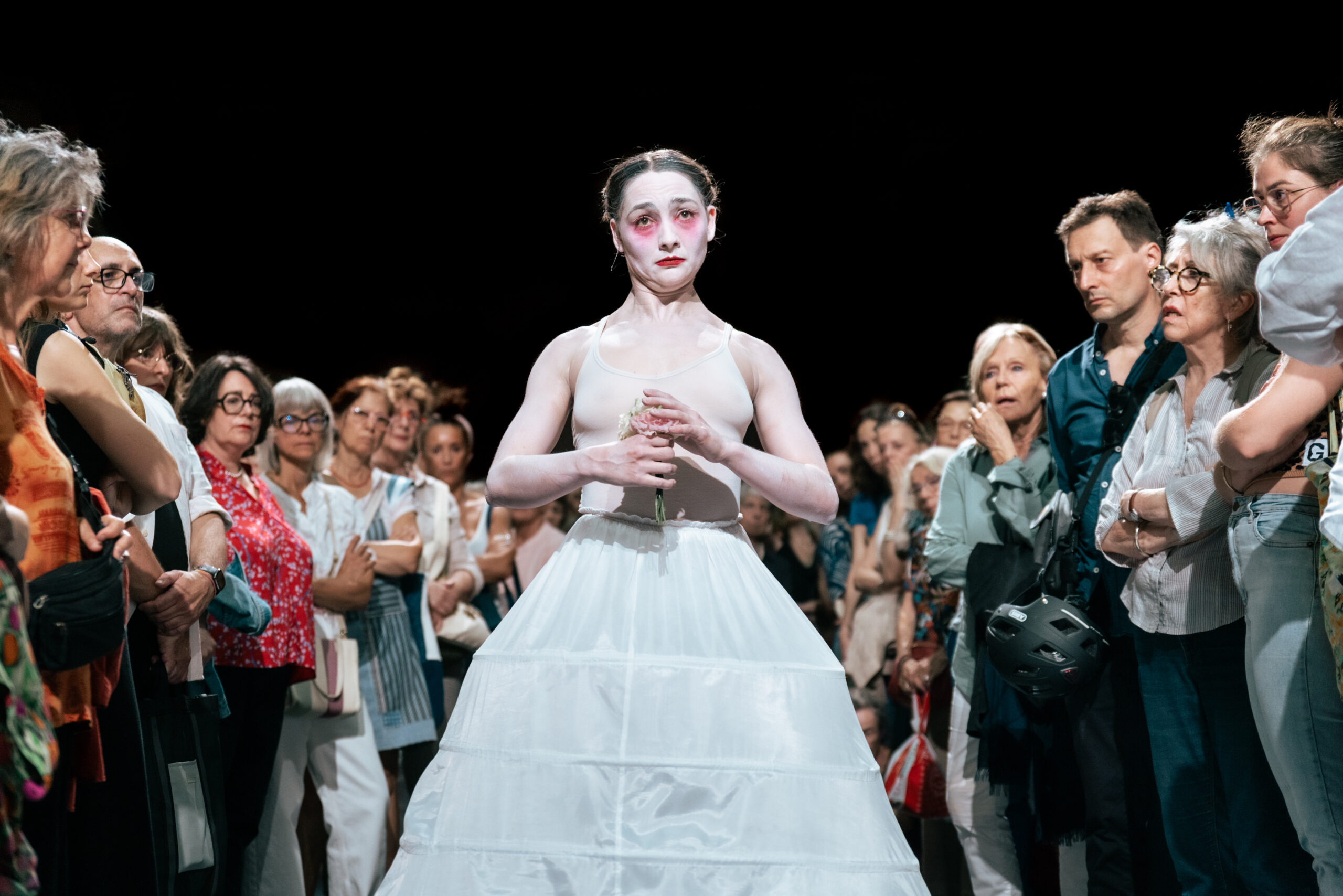 La performance de Rebecca Journo est époustouflante. Comme en transe, ses yeux fixent le vide et ses mains se tordent, semblant implorer de l'aide. Parfois, alors qu'elle fend la foule des spectateurs debout, elles se cambre, se cabre et s'effondre brusquement vers l'arrière. Le corps tendu, elle reprend sa marche en avant, comme une Coppélia déréglée et possédée ou une Giselle devenue folle. Une pratique qui renoue avec la tradition hiératique et sensible du butoh, cette danse des ténèbres japonaise, où les danseurs s'affichaient le corps poudré de blanc.