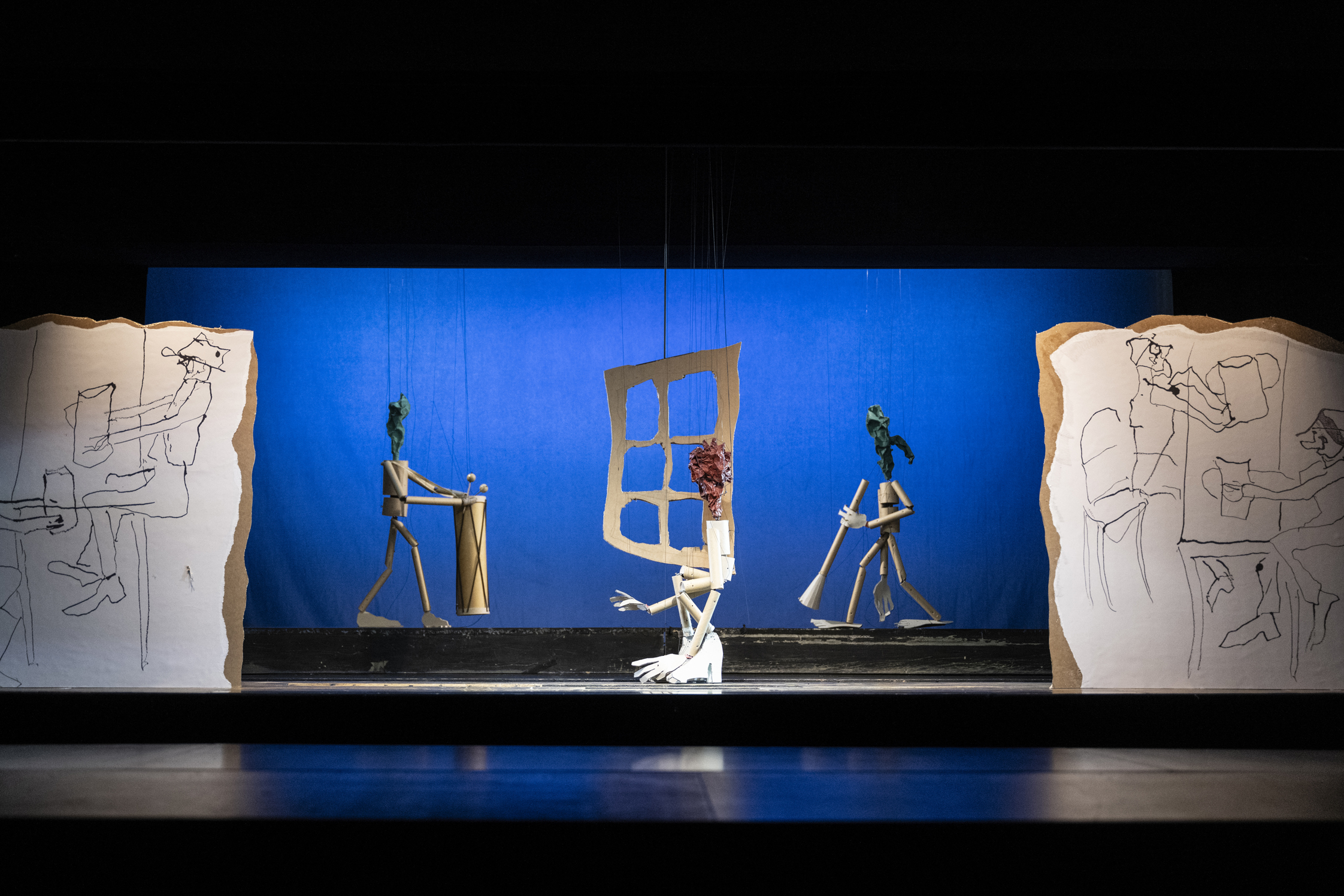 Baselitz, certes, est une superstar du monde de l'art, et son seul nom suffit à faire du spectacle un événement, mais fort heureusement l'œuvre prend sans mal le pas sur ces mondanités : il trouve ici une forme beaucoup plus adéquate que dans le Parsifal pesant qu'il avait décoré à l'Opéra de Munich. Les deux marionnettes de musiciens, tambour et trompette, qui accompagnent le soldat dans sa marche ne servent à rien, mais ils en soulignent le rythme avec humour, leurs mouvements en harmonie en même temps qu'en décalage avec le rythme propre du soldat ; les corps simplement indiqués par des tubes de carton ont cette fragilité touchante qui fait de la marionnette une image de la destinée humaine, la nôtre et celle du pauvre soldat – et même celle du diable, qui n'est après tout qu'un pauvre hère à notre image. Histoire « jouée et dansée », dit le sous-titre de l'œuvre : les marionnettes, manipulées par l'équipe du célèbre théâtre de marionnettes de Salzbourg, ont cette grâce qui supprime toute distinction entre le jeu et la danse.