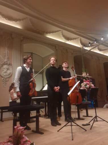 Après l'entracte, les trois solistes – enfin réunis ! – nous offrent une version à la fois électrisante et dramatique du rare et virtuosissime Trio en ut mineur opus 66 de Félix Mendelssohn, programmé in situ pour la première fois en sept décennies. L'interprétation est magnifiée à la fois par la symbiose parfaite des deux cordes et par l'absolue transparence du jeu de Julien Libeer, même dans les passages les plus touffus. Sans jamais négliger l'influx trépidant et torrentiel des temps extrêmes ou la diaphane vélocité du scherzo, les interprètes creusent aussi le côté sombre et pudiquement émotionnel de l'œuvre, notamment au gré d'un ineffable Andante espressivo, suspendu entre ciel et terre. Pour remercier un public débordant d'enthousiasme, et en guise d'au revoir, le trio offre en bis, extrait de l'autre opus mendelssohnien pour la formation l'andante con moto tranquillo avec une probité sereine et une félicité immatérielle et songeuse.