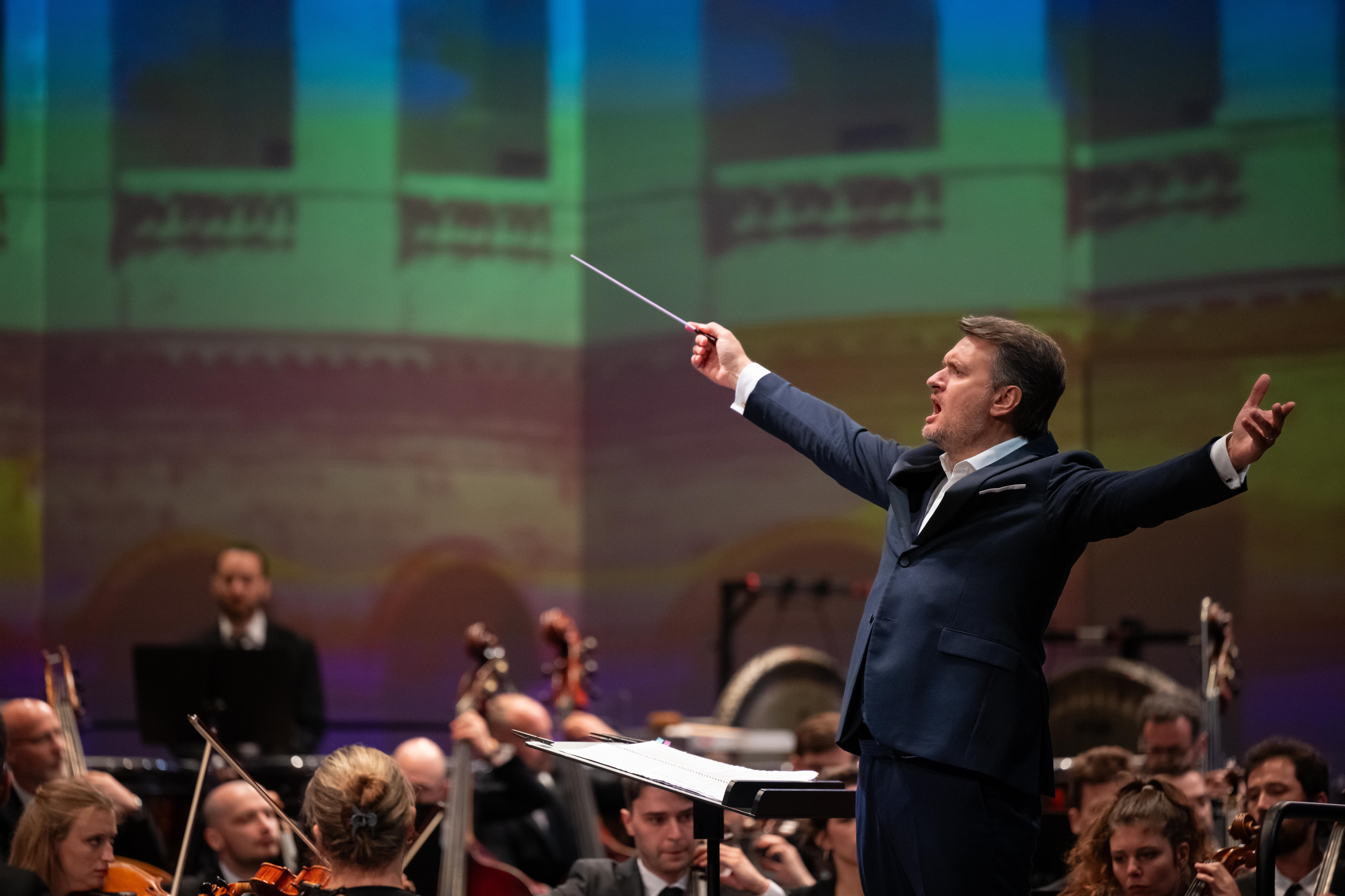 La vie, la mort : deux notions forcées plus que jamais à la cohabitation par une actualité délétère extra muros. Intra muros, c'est aux chefs berlioziens subitement disparus (chacun à sa façon) d'un festival qui avait si bien su les fidéliser, que l'on ne peut s'empêcher de penser à l'orée du concert, et notamment au plus berliozien d'entre eux, François-Xavier Roth, dont l'interprétation du Requiem en 2018 reste une des heures de gloire du festival. C'est à ce deuil a priori impossible qu'en reprenant la baguette ainsi laissée là, Mathieu Herzog va devoir s'atteler corps et âme : faire d'un hymne à la mort un hymne à la vie. Ce qu'on pressent dès les premières mesures d'un Dies Irae pris avec allant. Dès le début on devine aussi que le chant ne sera pas un instant écrasé par l'orchestre : toutes les voix (hommes très affirmés, très articulés, femmes irradiantes) sont propulsées au plus haut d'un geste qui semble embrasser un univers préfigurant la symphonie mahlérienne des Mille. Les baskets blanches de Mathieu Herzog s'affranchissent elles aussi littéralement de la pesanteur terrestre par des élans venant rappeler que la performance est aussi sportive.