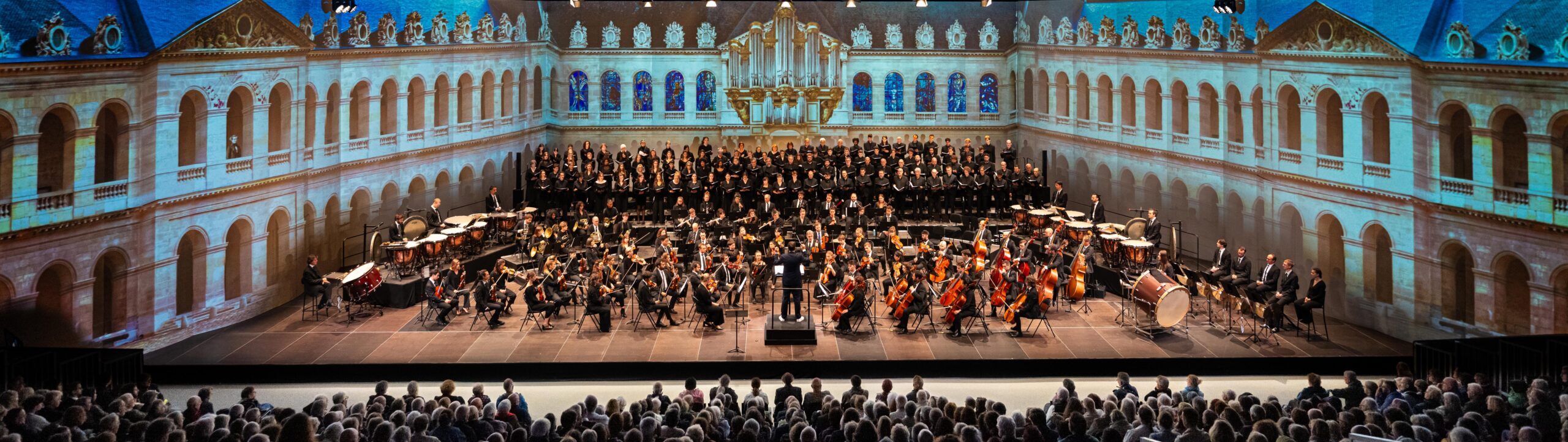 Le Requiem est de ces œuvres auxquelles même la meilleure version discographique n'est en mesure de rendre son plein impact physique, avec ses orchestres de cuivres antiphoniques exilés aux quatre coins de la salle et ses seize timbales se faisant face de cour à jardin. L'effectif berliozien de la création (447 musiciens) appartient à une époque révolue : s ‘appuyant sur « le nombre relatif » de participants visé par Berlioz à même la partition, le Festival n'a pas fait les choses à moitié pour donner la mesure des déflagrations de pur effroi d'une œuvre qui, comme on le sait, comporte au moins autant de numéros intimistes, et même un a cappella (le si consolatoire Quaerens me, sonnant dans la cour du Château Louis XI comme les Vêpres de Rachmaninov). Après Les Siècles, c'est au tour de l'orchestre Appassionato (dix ans d'âge déjà), dont la quarantaine d'instrumentistes a été considérablement étoffée, et de cinq chœurs (Spirito, Jeune Chœur symphonique de Lyon, Jeune choeur d'Auvergne, Maîtrise de petits chanteurs de la cathédrale de Lyon, Chanteurs amateurs de la région Auvergne-Rhône-Alpes : soit une bonne centaine de chanteurs) de gravir l'Everest musical de Berlioz. Il faudra attendre les saluts pour faire connaissance de visu avec la totalité du pupitre des cuivres, le plateau, presque surpeuplé, n'étant autorisé qu'aux seuls cors et, plus loin, à deux tubas.
