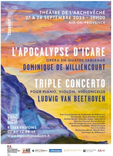Les 27 et 28 septembre 2025, sur cette scène mythique des opéras, il donnera 2 soirées au format unique d’un opéra-concert avec le Triple concerto de Beethoven en première partie et son opéra en 4 tableaux, L’Apocalypse d’Icare. Dominique de Willencourt interroge sur la fatalité et la révélation de la chute d’Icare, tandis que la créativité de sa femme Guillemette de Williencourt, offre une dimension visuelle captivante de l’Apocalypse de Saint Jean, avec ses sculptures géantes en papier maché et des peintures de la Montagne Sainte Victoire, si chère à Paul Cézanne.