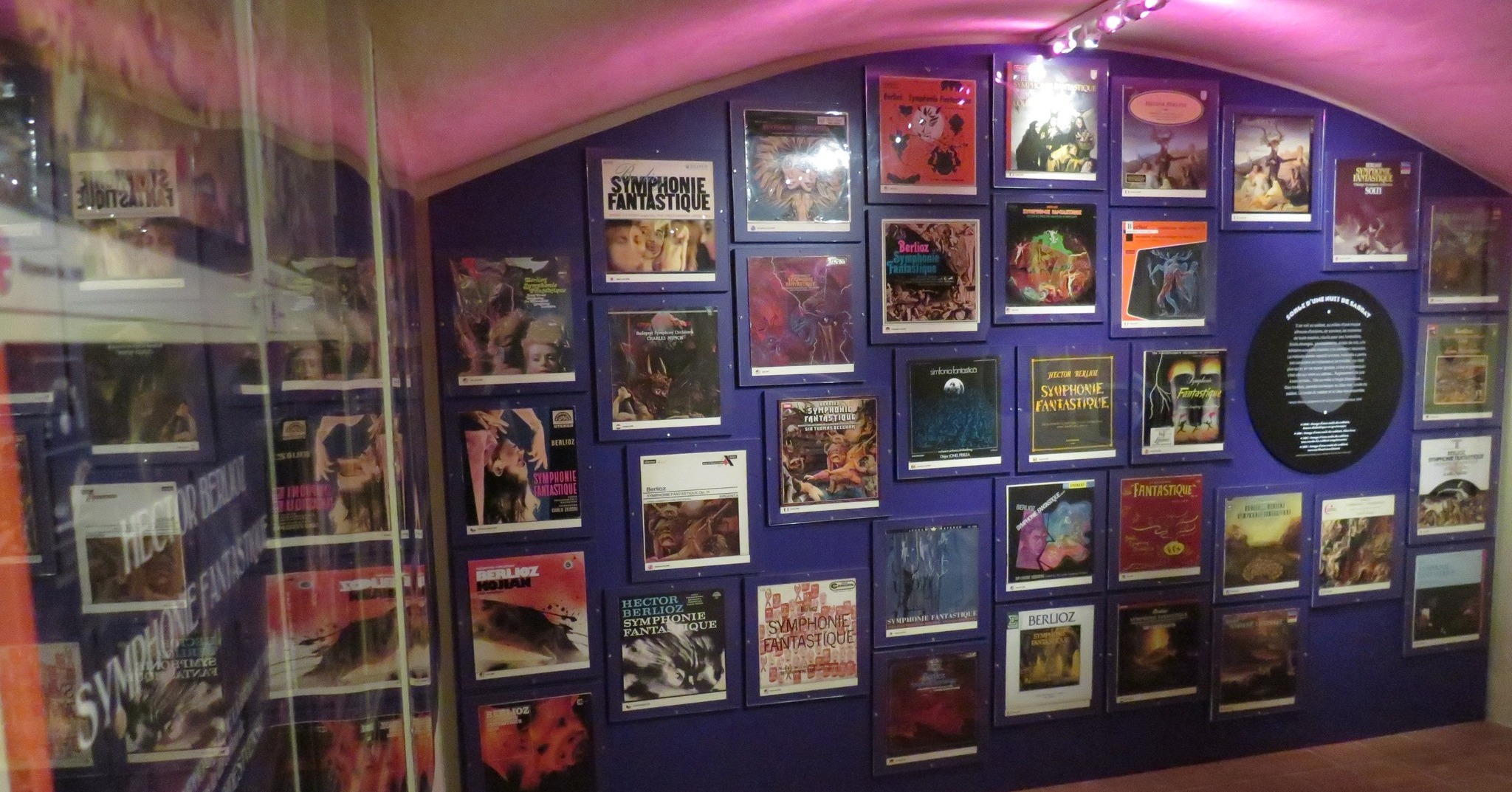 Diffusé en boucle entre un phonographe à monnayeur et un combiné radio/électrophone, un petit dessin animé d'Eugène Boitsov Gordon sert de fond sonore à une remontée dans le temps des plaisirs discographiques : reprenant le personnage de Monsieur Onde, le génie de la Philharmonie de Paris, narre en 3 minutes 30 chrono le programme de la symphonie. Un temps où les pochettes de disques rivalisaient d'invention (les tableaux de maîtres le disputant aux trouvailles graphiques) pour attirer l'œil du chaland. Celles de la Fantastique se sont toutes donné rendez-vous dans la maison natale du compositeur. L'auteur de ces lignes y a retrouvé intacts ses premiers émois berlioziens devant la version de Louis de Froment dirigeant le Grand Orchestre de Radio Luxembourg, lovée entre d'autres qui l'avait fait sombrer dans l'oubli : une vitrine complète est par exemple dédiée à huit pochettes différentes de la première version de Colin Davis chez Philips avec le London Symphony Orchestra ; on rappelle aussi que Munch l'enregistra six fois entre 1947 et 1967 ! Philips, Decca, CBS, Erato…. les grands labels, qui n'avaient pas encore fusionné, sont tous là, mais aussi les plus petits depuis longtemps disparus : Fontana, Mercury, Telarc, Vox, Angel, Capitol, Victrola, Heliodor, Seraphim…