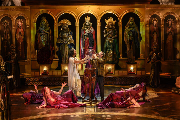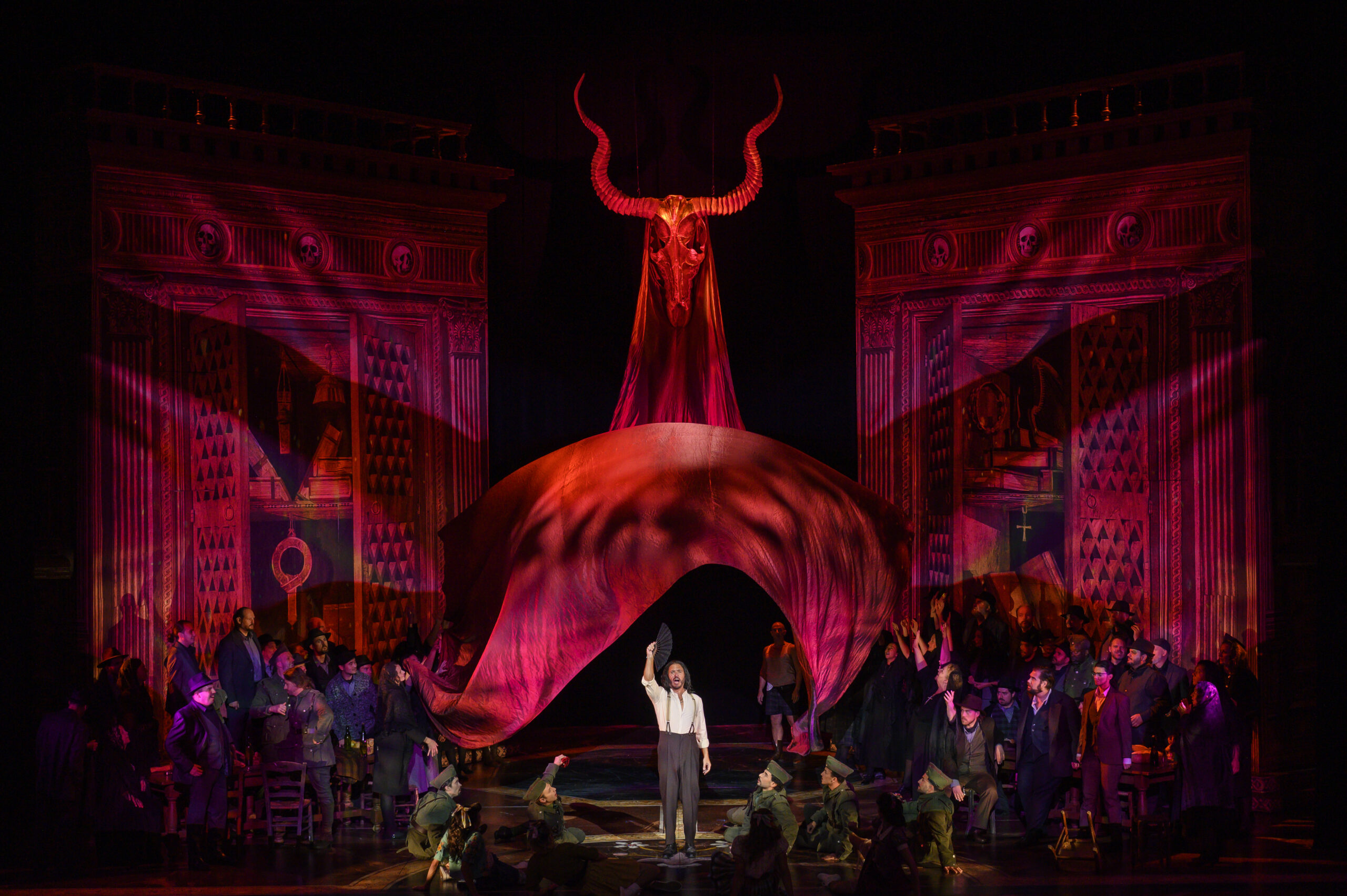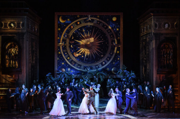 En réponse, au deuxième acte, le surgissement du Veau d'or est évoqué par ce crâne de bouc géant et mordoré, drapé d'un colossal et fluide rideau amarante, et au quatrième acte, le Thanatos méphistophélique s'incarne tantôt en d'autres crânes géants, cette fois bien humains, vanités allégoriques de notre finalité, tantôt par ce tabernacle d'or peuplé de figurants-squelettes revêtus de somptueuses broderies, à la façon des dépouilles des catacombes des Capucins à Palerme – à moins que ce ne soit une réminiscence de la momie de Rascar Capac pour les tintinophiles. Tous ces éléments finement intégrés donnent une profonde cohérence au spectacle, faisant l'impasse sur l'aspect religieux un peu datée du livret : une totale réussite là où Strassberger avait davantage échoué dans sa Traviata trop flashy, tape-à-l'œil et bigarrée, ici même, il y a juste un an !