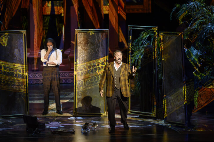 Ces éléments foisonnants mais circonstanciés sont visuellement sculptés par des lumières tantôt obscures tantôt flamboyantes absolument sublimes. Parfaits contrepoints visuels de cette mise en scène à la fois délirante et très creusée, les magnifiques costumes de Giuseppe Palella oscillent entre imaginaire pictural – les spectres fantomatiques du quatrième acte, le decorum du partage entre Ciel et Enfer du cinquième – et pragmatiques éléments d'une mode rétro – avec la foule bigarrée du deuxième acte, ou plus loin, les vêtements de deuil ceinturant les chœurs.