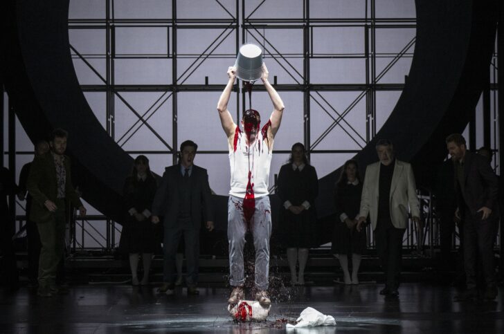 Le gris noir d'un décor (Henrik Ahr) fait de d'escaliers, de poutrelles, de cylindres de métal, le manque de recherche des costumes (Barbara Drosihn) généralement quelconques et de couleurs pastels sales, le statisme des personnages, le conformisme des mouvements de foule du chœur, désenchante cet opéra de la résurrection et de la repentance pour l'enfouir dans une mise en scène d'une banalité confondante, en dépit d'éclairages (Stefan Bolliger) souvent subtils. Bien sûr, restent les maquillages et démaquillages en direct de Tannhäuser en clown (le retour du Parsifal genevois de 2023 ?) et l'orgie d'hémoglobine dont il se verse un plein seau sur la tête qui sont la marque de fabrique de Michael Thalheimer. Dans cet univers d'acier d'une froideur désolante, transposer un récit tiré du grand romantisme allemand du XIIIe siècle, avec ses ménestrels et l'esprit de l'amour courtois s'avère compliqué à réaliser. Notre époque manque des repères de la culture médiévale pour élever le discours des oppositions entre la luxure et la pureté. Sans cela, la démarche de Michael Thalheimer s'éteint par manque de grandeur. Dès lors s'appuyer sur le seul chant des protagonistes de cette production pour apporter le bagage émotionnel nécessaire à la réflexion profonde voulue par Richard Wagner est un leurre.