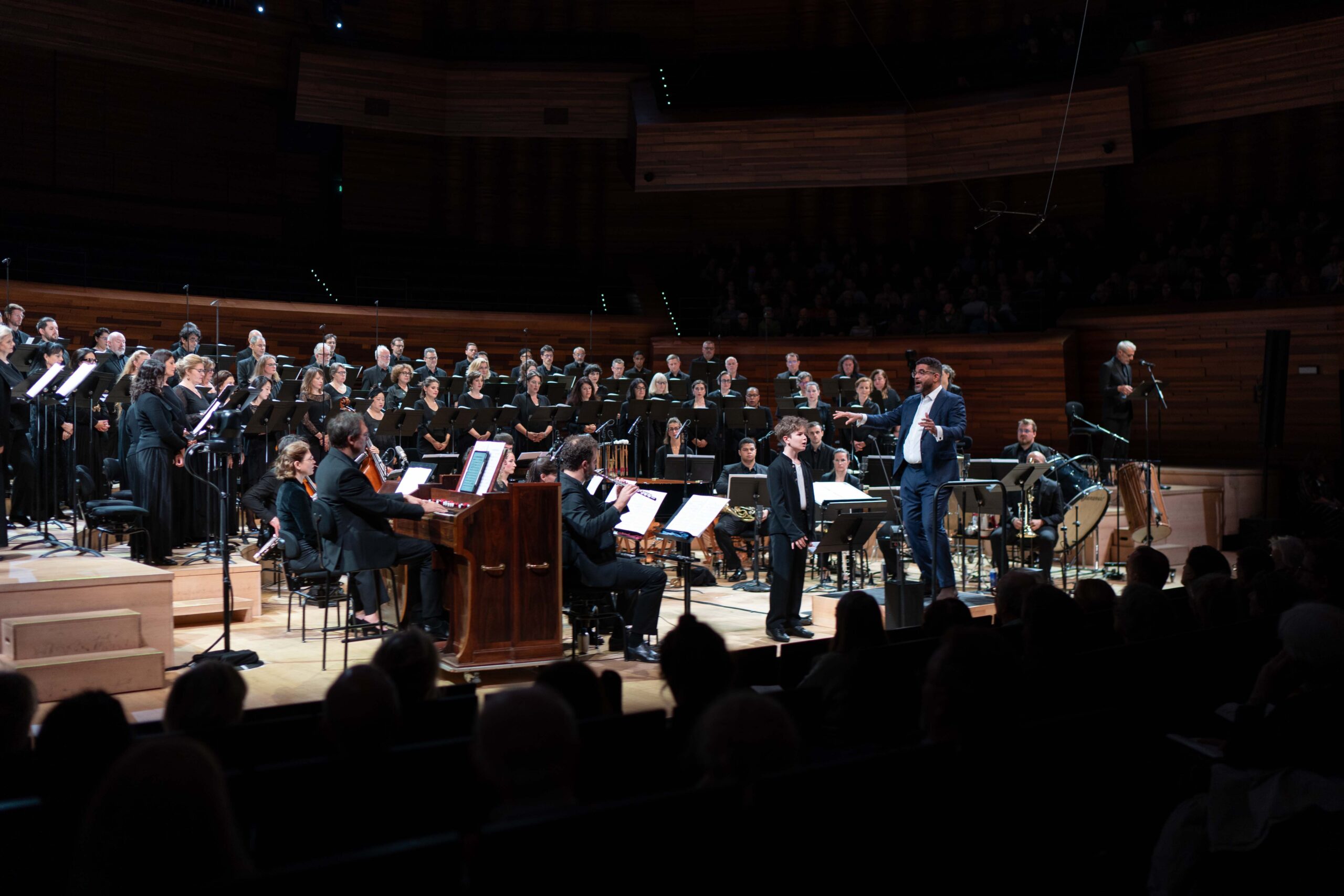 Resserré sur le devant de la scène, l'ensemble Les Apaches ! enfermé par la masse du Chœur de Radio France se retrouve souvent noyé, malgré l'ajout de la contrebasse en plus du violoncelle, là où le choix est normalement laissé ad libitum pour l'un ou l'autre du seul instrument à cordes prévu par la partition. Et plutôt qu'être conduit par son directeur musical et fondateur Julien Masmondet (présent dans le public), l'ensemble est dirigé par le chef du chœur, Lionel Sow, très lent dans les tempi et d'une gestuelle plus adaptée à un ensemble de chanteurs qu'à dynamiser des instrumentistes. À cette lenteur et une façon souvent trop lyrique d'aborder le chant, malgré quelques moments superbes comme le merveilleux Psaume « Je t'aimerai, Seigneur, d'un amour tendre » en 3ème partie, s'intègrent de nouvelles parties dues à la plume du compositeur Othman Louati.
