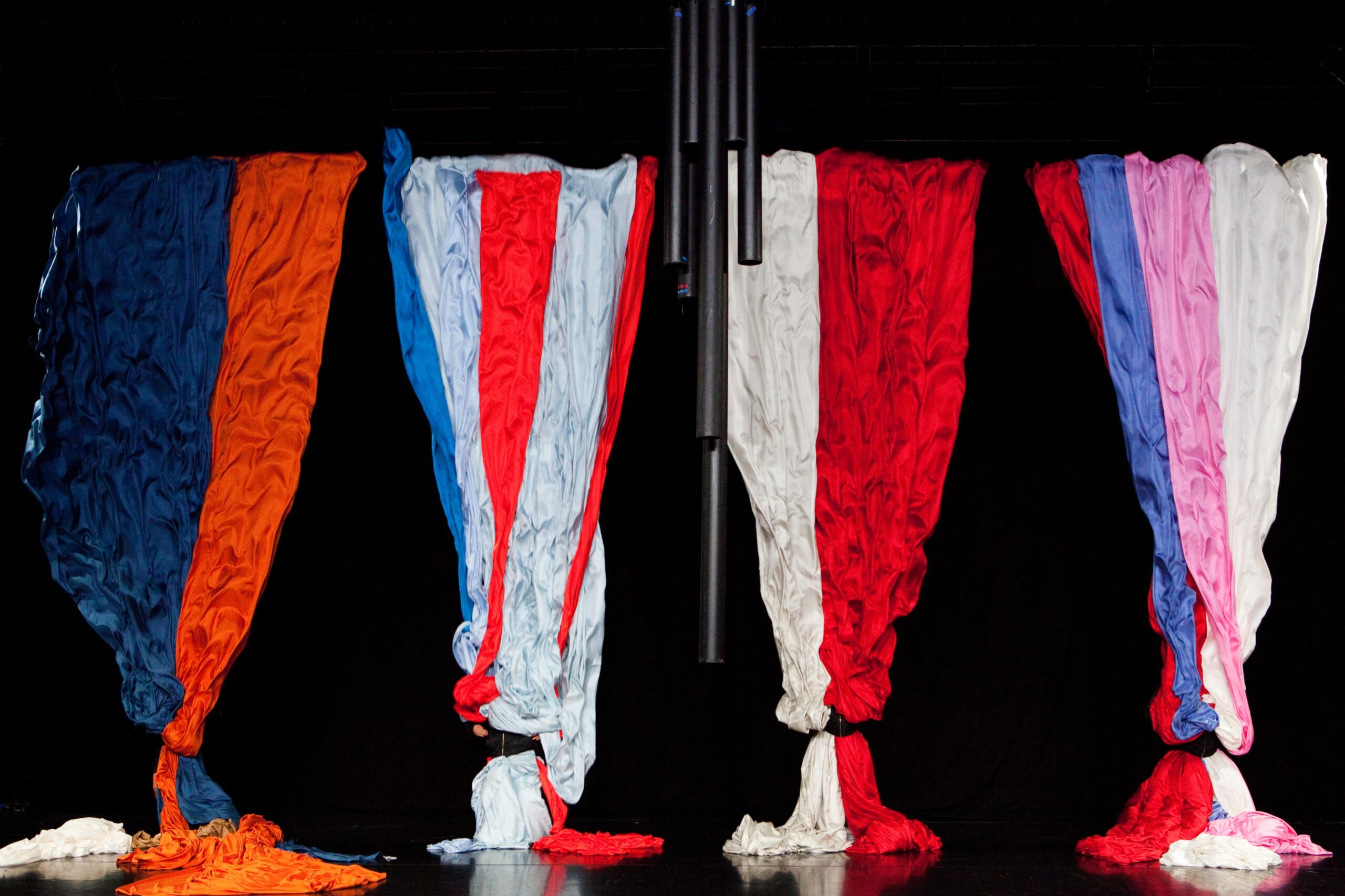 On entre dans cette performance intrigué, et on se laisse porter par les images véhiculées par les tissus colorés, notamment l'impressionnante vague qui engloutit à deux reprises une danseuse, ou un arc en ciel de soies colorées qui semble émerger des corps mêmes des artistes. Ces moments calmes contrastent avec la frénésie qui sévit sur scène le reste du temps, lorsque les rouleaux de tissu tombent du plafond par exemple, aussitôt saisis par les danseurs pour les dérouler ou les enrouler, etc. à l'image événements qui nous tombent dessus, qui s'accumulent et que l'on essaie, tant bien que mal, de gérer. Miet Warlop arrive à chorégraphier ce chaos et y insuffle de la poésie, ce qui, en soi, est une performance.