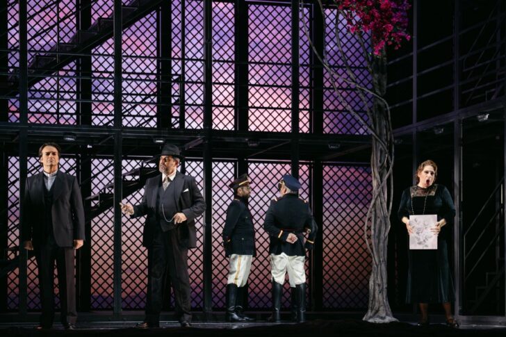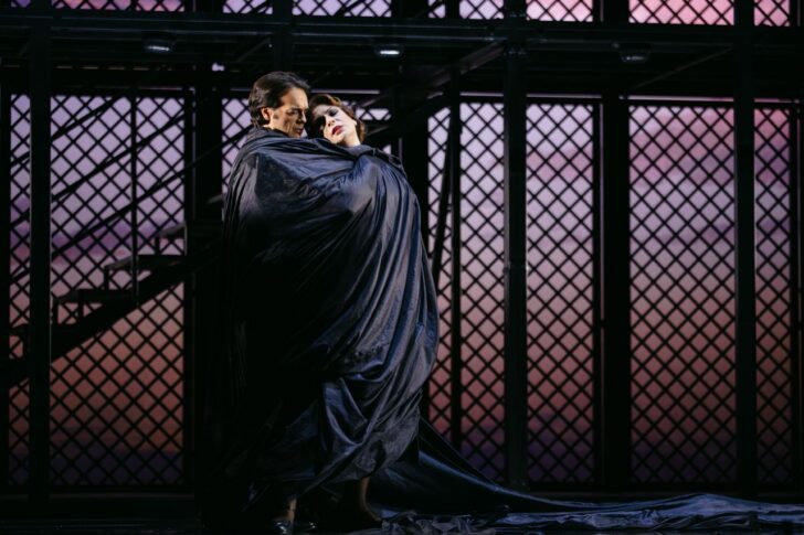 La scénographie épurée et grandiose, due à Daniel Bianco, est constituée d'un monumental échafaudage métallique installé sur une tournette où évoluent les chanteurs, renforçant ainsi l'impression d'enfermement psychologique sans issue dans lequel se trouvent les protagonistes, agrémenté de façon minimaliste d'un bougainvillier au I et d'un lit au III.