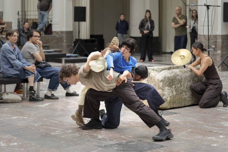 Ici, dans cette création pour le Festival d'Automne, dont il est familier, ayant fait l'objet d'un vaste « Portrait » en 2023, il est dans son élément avec les installations délicates et complexes de son complice libanais. On regrette d'ailleurs de ne pas comprendre davantage la façon dont fonctionnent les « instruments » de Tarek Atoui. Il faut aller ensuite (mais l'idéal eût été de les décrypter avant, ce qui n'est pas vraiment proposé) sur le plateau de la Ménagerie de verre (un simple lino accessible puisque le public peut même choisir de s'y installer pour le spectacle). On découvre alors de géniales constructions : un vieux bassin en pierre qui recueille des gouttes d'eaux tombant sur une cymbale, des panneaux en fer grattés mettant alors en route des sons externes, une vielle à roue électrique, des carrés de tissus se mettant à résonner lorsqu'on bouge dessus, une grosse caisse accueillant une boule sonore, des fils électriques qui permettent de donner du son aux mouvements de deux danseurs en danse contact permanente.