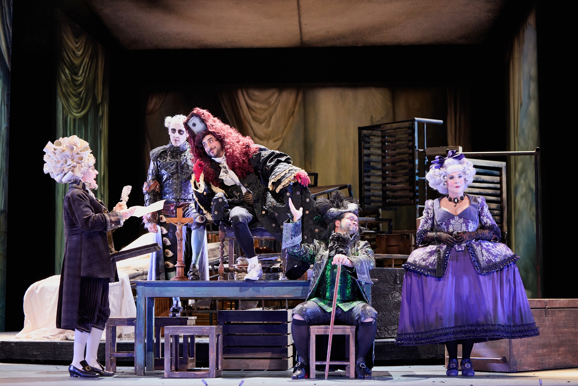 Munich. Gärtnerplatztheater. 10-X-2025. Johanna Doderer (née en 1960) : Der tollste Tag, opéra d’après la pièce de Peter Turrini, inspirée du Mariage de Figaro de Beaumarchais. Mise en scène : Josef E. Köpplinger ; décor : Heiko Pfützner ; costumes : Birte Wallbaum. Avec Daniel Gutmann (Figaro), Anna-Katharina Tonauer (Susanne), Daniel Schliewa (Comte Almaviva), Réka Kristóf (Comtesse Almaviva), Paul Clementi (Cherubin), Juan Carlos Falcón (Bazillus), Levente Páll (Bartholo), Anna Agathonos (Marcelline)… Orchester des Staatstheaters am Gärtnerplatz, direction : Eduardo Browne