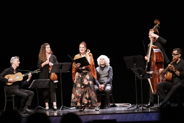 Sur scène, la fête est totale avec la forte présence scénique et vocale de la mezzo-soprano Isabelle Druet, qui incarne à merveille, avec conviction et vitalité, ces pages chantées, parlées, voire dansées, alternant entre l'affliction d'un lamento et l'exubérance de pièces d'inspiration populaire. Les savantes diminutions du violon de Rozarta Luka sont un délice, soutenues par la viole de gambe de Lucas Peres, jouée et tenue parfois, en cordes pincées comme une guitare augmentée, tandis que la contrebasse de Simon Guidicelli, également frottée et pincée, comme en jazz, donne une assise à l'ensemble. Avec ses percussions multiples, qu'il manie avec une élégance chorégraphique, Joël Grare est un véritable showman, notamment dans un éblouissant solo en grande partie improvisé. Comme de juste, l'indispensable guitare baroque de Vincent Dumestre, mène la danse selon une frénétique virtuosité par un jeu d'accords battus ou pointés.