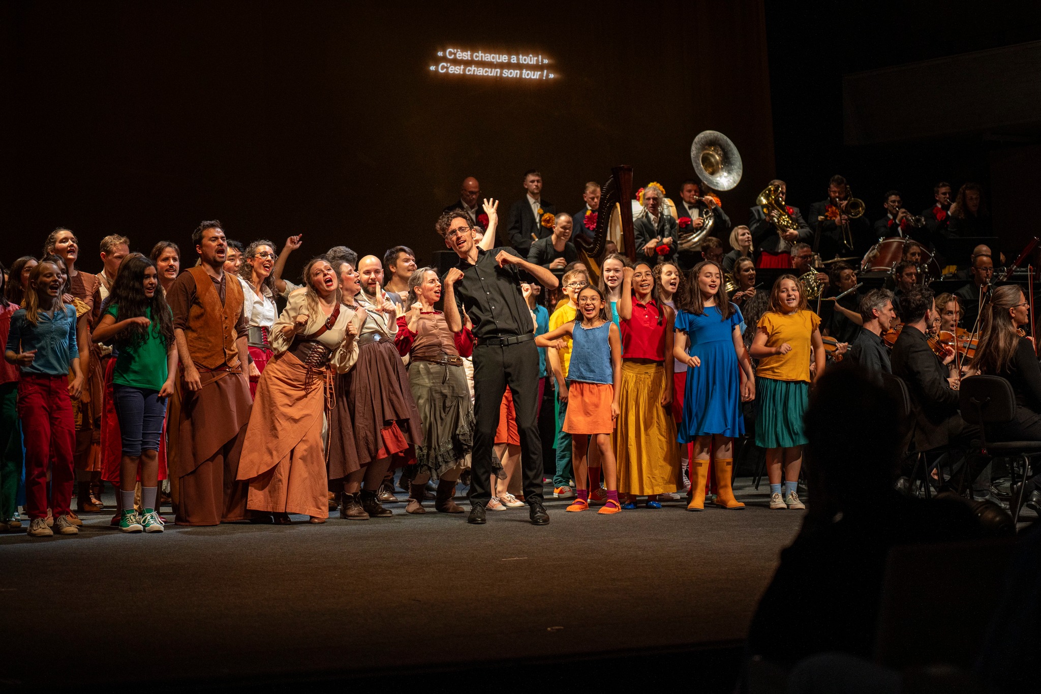 L'œuvre se veut donc logiquement collective et chorale, sans soliste du chant. Mais elle va aussi au-delà du concept d'oratorio, par une simple mais efficace mise en espace (confiée à Ingrid von Wentoch Rekowski) en lumières (un superbe travail signé Gérard Maraite) mettant en valeur par une gestique et une expression corporelle toujours très à-propos des chœurs revêtus de costumes sobres (dus à Satu Peltoniemi), traditionnels et passéistes pour les adultes, délibérément plus actuels, légers et colorés pour les enfants.