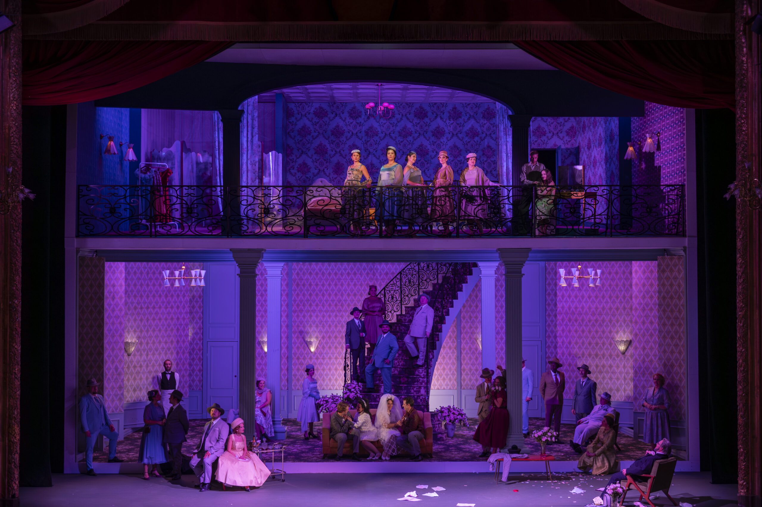 Les éclairages flashy et denses de renforcent cette référence aux comédies ou sitcoms américaines des Golden Sixties — tout comme les chignons démesurés affublant Fiordiligi et Dorabella, ou leurs changements de tenues éloquents au gré de l'action renvoient à une certaine superficialité : vestimentairement c'est un défilé de mode, passant des coupes traditionnelles pastel initiales aux robes suggestives, écarlate et orange selon le désir, aux pyjamas cosy puis enfin aux immaculées robes nuptiales.