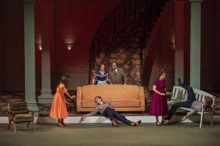 Liège. Opéra Royal de Wallonie. 12-X-2025. Wolfgang Amadeus Mozart (1756-1791) : Cosi fan tutte. Opera buffa en deux actes sur un livret original de Lorenzo da Ponte. Mise en scène : Vincent Dujardin. Décors et costumes : Leila Fteita. Lumières : Bruno Ciulli. Avec : Francesca Dotto : Fiordiligi ; José maria Lo Monaco : Dorabella ; Maxim Mironov : Ferrando ; Vittorio Prato : Guglielmo ; Marco Filippo Romano : Don Alfonso ; Lavinia Bini : Despina. Enrico Cicconofri, pianoforte continuo. Choeurs de l’Opéra Royal de Wallonie, préparés par Denis Segond. Orchestre de l’Opéra Royal de Wallonie, direction : Sieva Borzak