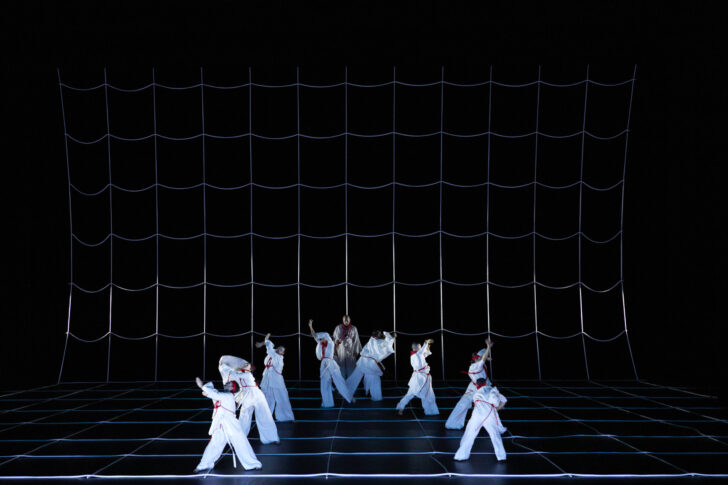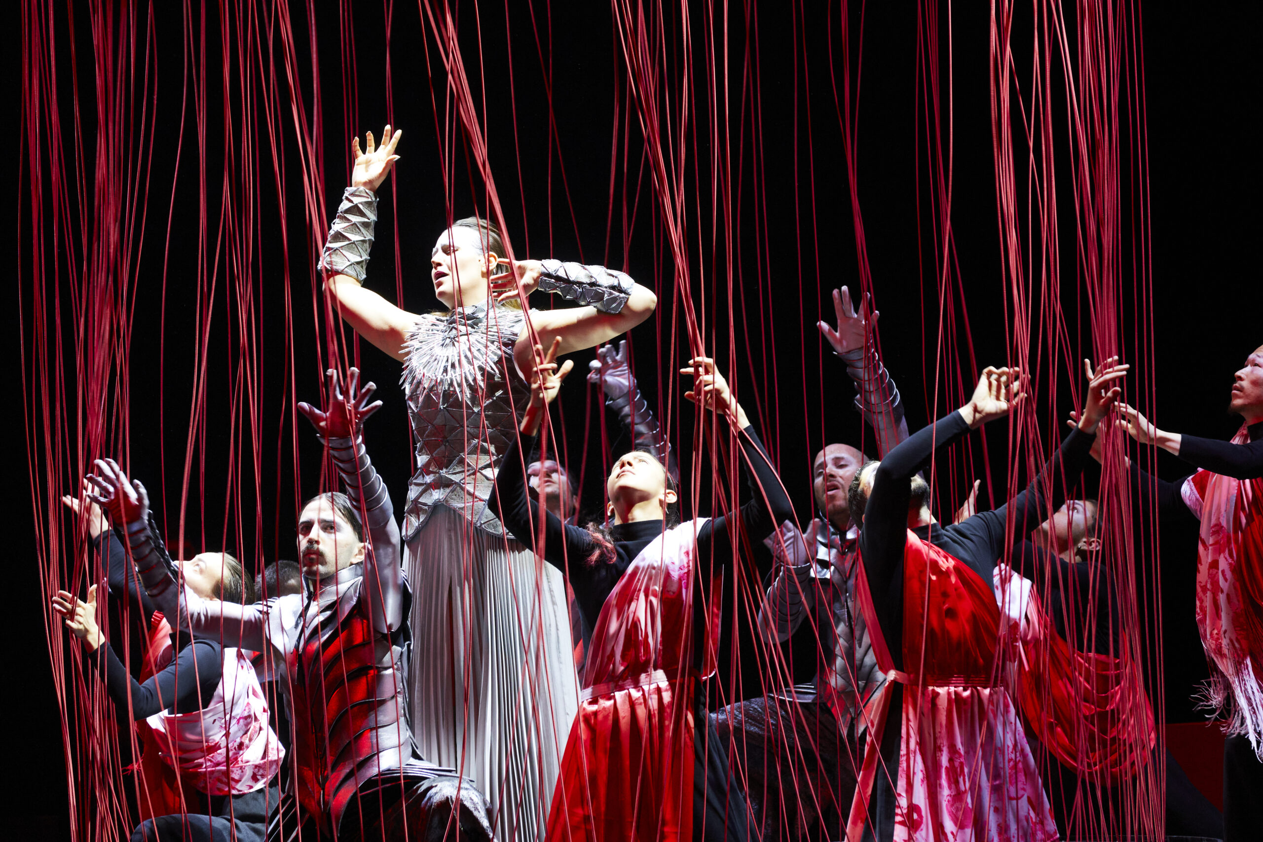 Créé à Genève en février 2024, le spectacle de Sidi Larbi Cherkaoui n'avait pas plu à tout le monde, notamment en raison des libertés prises avec le texte et le traitement de l'intrigue. Ces dernières, en fonction desquelles Idoménée laisse mourir Idamante et Ilia avant d'épouser Elettra, ne seraient d'après le metteur en scène et chorégraphe qu'une manière de retourner au mythe originel, non édulcoré par l'idéologie des Lumières du XVIIIe siècle et la tradition du lieto fine de l'opera seria. « Lisez la tragédie française », précisait le programme destiné au public de la création de l'opéra de Mozart en 1781 ; on se souvient que chez Campra Idamante est effectivement tué par son père… De fait, les couleurs rouge sang qui envahissent le plateau, auxquelles se mêlent le noir, le blanc et diverses nuances de gris, marquent elles aussi ce retour à la brutalité du mythe. Elles sont soulignées par les superbes éclairages de Michel Bauer, ainsi que par la chorégraphie très hachée de Sidi Larbi Cherkaoui, laquelle va jusqu'à affecter la gestuelle des solistes vocaux. Ces choix esthétiques sont en parfait accord avec l'admirable scénographie de la plasticienne japonaise Chiharu Shiota, qui déploie sur le plateau de superbes réseaux de fils, filets, maillages et cordages tombés des cintres, métaphores des différentes situations dramatiques et psychologiques traversées par les personnages de l'opéra, mais également des éléments visuels capables de dessiner l'ensemble de l'espace scénique et de ses accessoires. Ces fils peuvent tout aussi bien représenter les chaînes qui emprisonnent les esclaves troyens exilés, que celles unissant les Crétois à la cité mise à feu et à sang ; ils peuvent figurer les liens affectifs reliant différents personnages entre eux, tout comme ils marquent les fils du destin dans lesquels s'empêtrent un à un les personnages de la tragédie. Dans la tradition japonaise, le fil rouge au petit doigt de chaque enfant nouveau-né établit un lien avec la personne qu'il est destiné à rencontrer au cours son existence. De façon plus triviale, les fils peuvent également tracer le mouvement des vagues de la mer qui accompagnent dans son exil l'air de la princesse Ilia « Se il padre perdei », ou alors figurer tempête et la mer démontée qui s'abattent sur la flotte d'Idomeneo. Ces choix esthétiques, qui certes privilégient la beauté plastique sur la cohérence de la narration, nous valent une succession de moments de pure poésie, à l'image de l'air d'Ilia au troisième acte, quand une spirale en métal descendue des cintres devient le temps de l'aria le vent auquel la princesse confie ses sentiments. Autre grand moment, le fameux « Fuor del mar » d'Idomeneo, chanté dans la carcasse d'une barque prise par les éléments, métaphore de la situation traversée à ce moment par le personnage. Ces moments d'exception hanteront longtemps la mémoire du spectateur comme des instants de pure magie au service d'une musique dont les éléments visuels soulignent l'étonnante modernité.