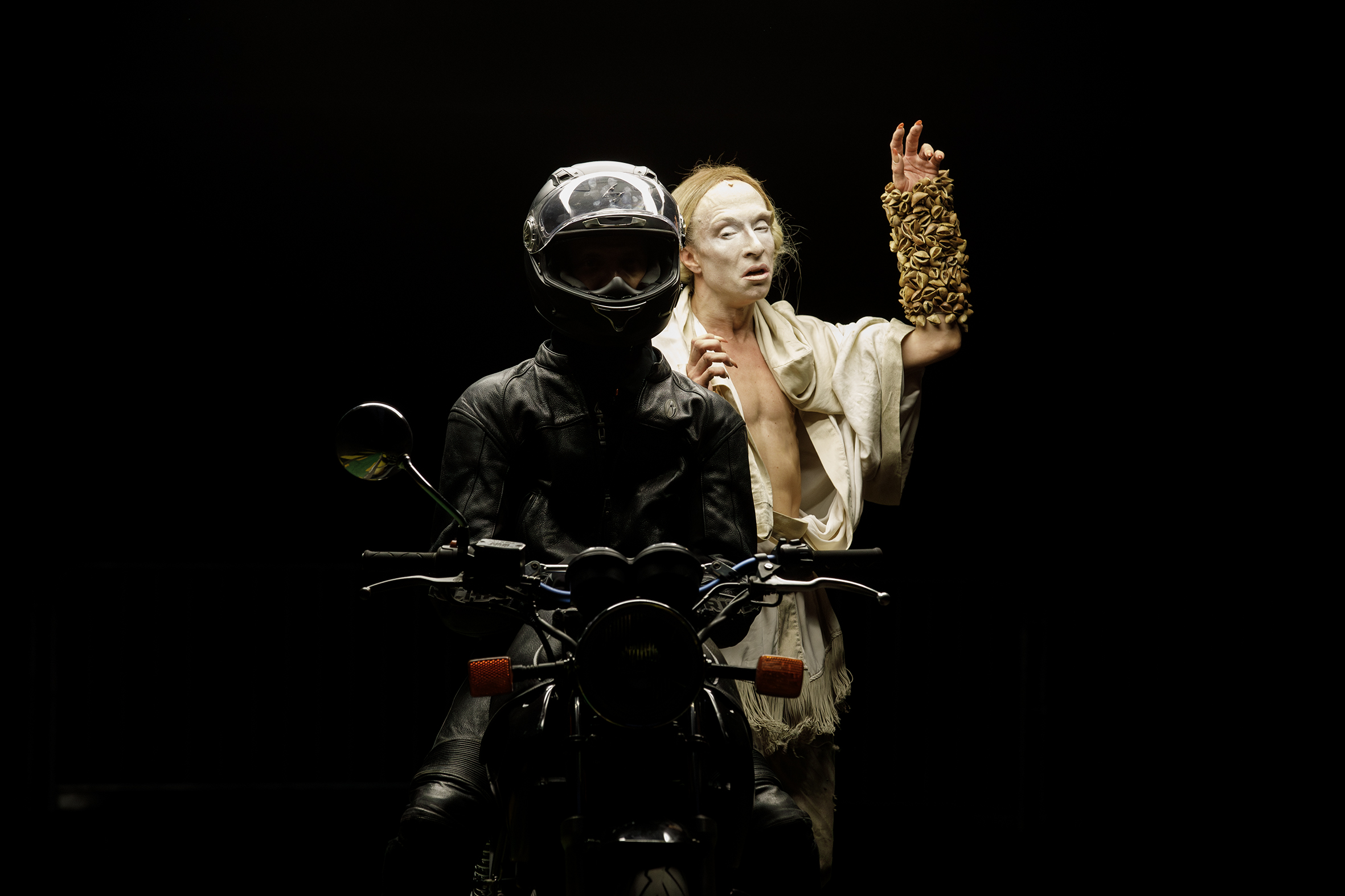 Puis, un étage au-dessus, une moto chevauchée par un motocycliste casqué et ganté de noir attend les spectateurs qui s'agglutinent autour des barrières métalliques délimitant l'espace de représentation. Pendant environ 30 minutes, François Chaignaud défiera la machine dans un duo à la fois sensuel et dangereux. Le visage fardé de blanc, comme le grand danseur de butoh Kazuo Ono, une tunique frangée sur les épaules, des bracelets et des guêtres de coques de nèfles, utilisées comme des castagnettes, le danseur se lance dans un solo presque flamenco, rythmé et absolument fantastique. Juché sur de très hauts talons, il s'allonge devant le motocycliste, puis s'étire dans un torride corps à corps au plus près de l'engin. Également contre-ténor talentueux, François Chaignaud chante Purcell, secouant ses frissonnants bracelets. Croisement entre danseur flamenco et idole dorée, le chorégraphe livre une extraordinaire performance devant l'impassible motocycliste. À la fin du solo, la tension monte alors que les moteurs s'allument lançant l'engin à petite vitesse, puis à plein régime, nous laissant groggy.
