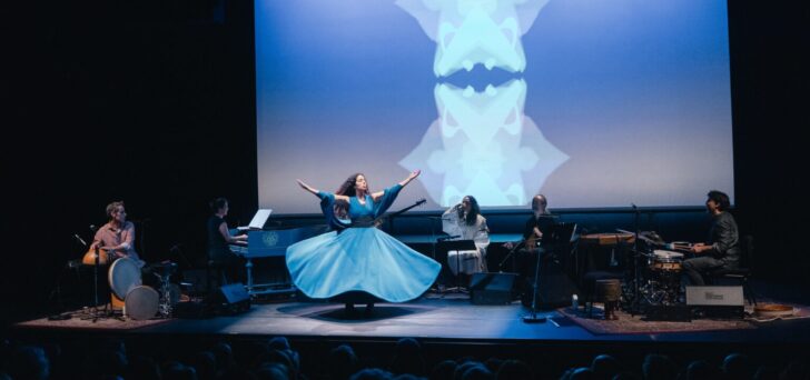 Chantés en persan, les textes s'échappent de la bouche de la merveilleuse Negar montpelliéraine Aida Nosrat (impressionnants sons gutturaux), ponctuation centrale du plateau. Des surtitres surplombent un écran consacré à l'art musicalligraphique de Bahman Panahi, lequel a fait le voyage à La Cité Bleue pour y être filmé en action : c'est sa main que l'on voit actionner le qalam qui trace sur certaines pièces les vagues et volutes d'un art millénaire. Autre point focal de cette réunion de talents, l'envoûtante danse soufie de Rana Gorgani, le samã, né au XIIIe siècle de la poésie incantatoire et des enseignements de Rûmî. Le derviche tourneur est ce soir une femme dont les bras, sortis d'étoffes tournoyantes changeant de couleur à chaque apparition, prônent l'union de la terre et du ciel, « l'invitation à l'amour universel et au dépassement de soi ». C'est le message d'une soirée dont le synergétique universalisme est reçu en apesanteur par un auditoire comblé dans une salle comble. Quelle plus vibrante adresse au mouvement iranien Femme, Vie, Liberté que cette que ces deux femmes libres de chanter, de danser…