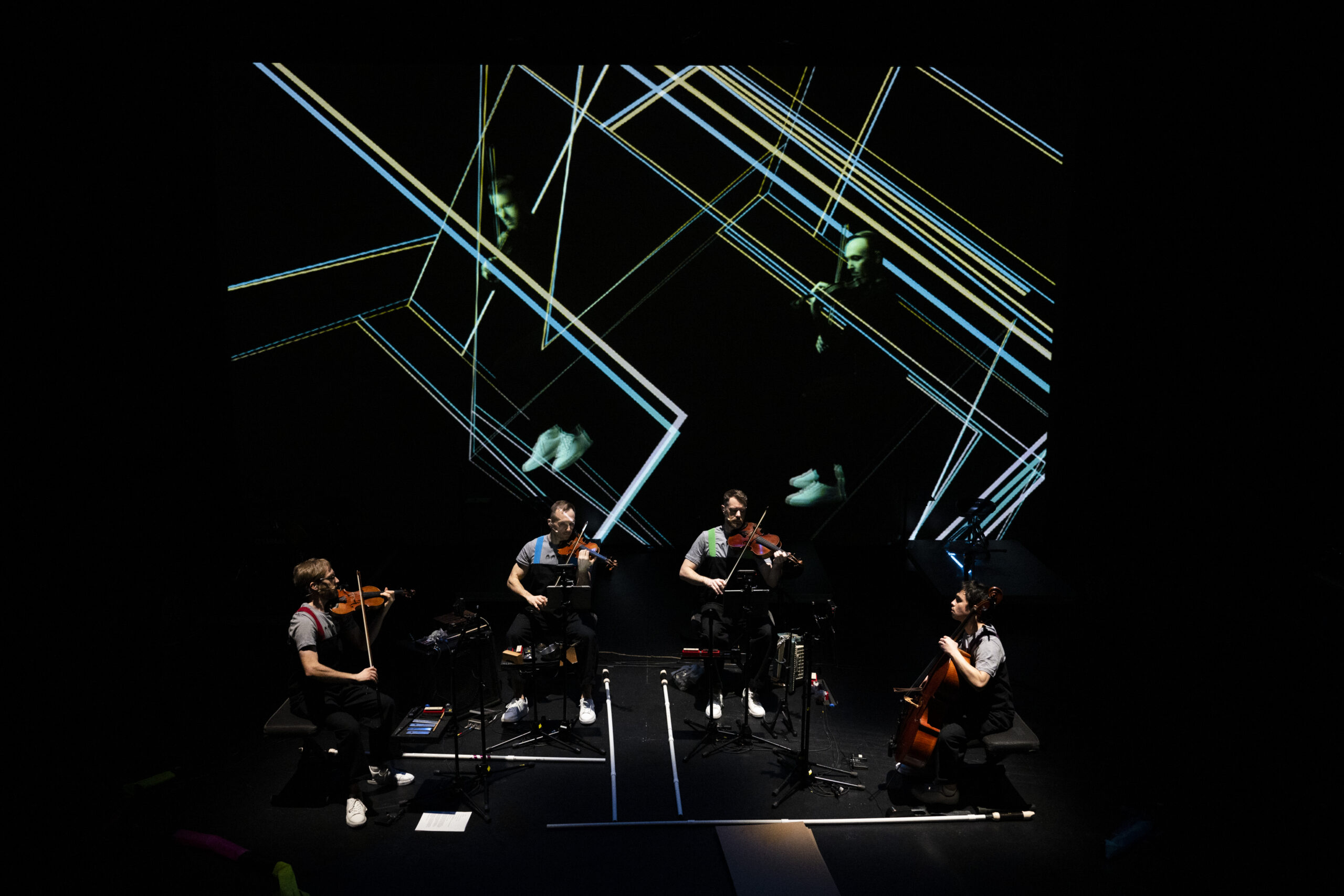 Leur tenue, imaginée par Maile Okamura, n'est d'ailleurs pas celle du concert : baskets blanches, tee-shirts et salopettes noires avec bretelles de couleurs différentes pour chacun d'eux. Ils frappent des pieds et claquent des doigts et de la langue, avec des gestes mécaniques de marionnettes, dans un long premier « acte » parlé et chorégraphié ; ils soufflent dans des flûtes à bec gigantesques en PVC dans le II, fredonnent une chanson folk, accompagnés au banjo par leur partenaire violoncelliste (acte III), ou participent à un jeu de société où il est question de spores de champignons nourris d'étoiles tombées du ciel… Les instruments du quatuor sont amplifiés, traités le plus souvent comme un méga-instrument à seize cordes, générateur de sons glissés ou bruités, les musiciens donnant de la voix autant que de l'archet. Ils ont aussi à portée de mains des petites percussions (carillon, sonnailles, harmonicas, etc.) ainsi qu'une grosse caisse que l'on entend parfois bourdonner.