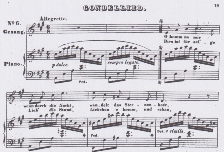 Quant aux œuvres de Fanny (environ 450) il s'agit initialement d'une série de Lieder avec accompagnement du piano sur les poèmes de Goethe, de Heine et d'autres poètes romantiques. On y diagnostique du premier coup d'œil son intention de s'offrir comme pianiste un podium pour le jeu perlé aux arpèges, comme par exemple dans cette Barcarolle op. 1 no. 6 :