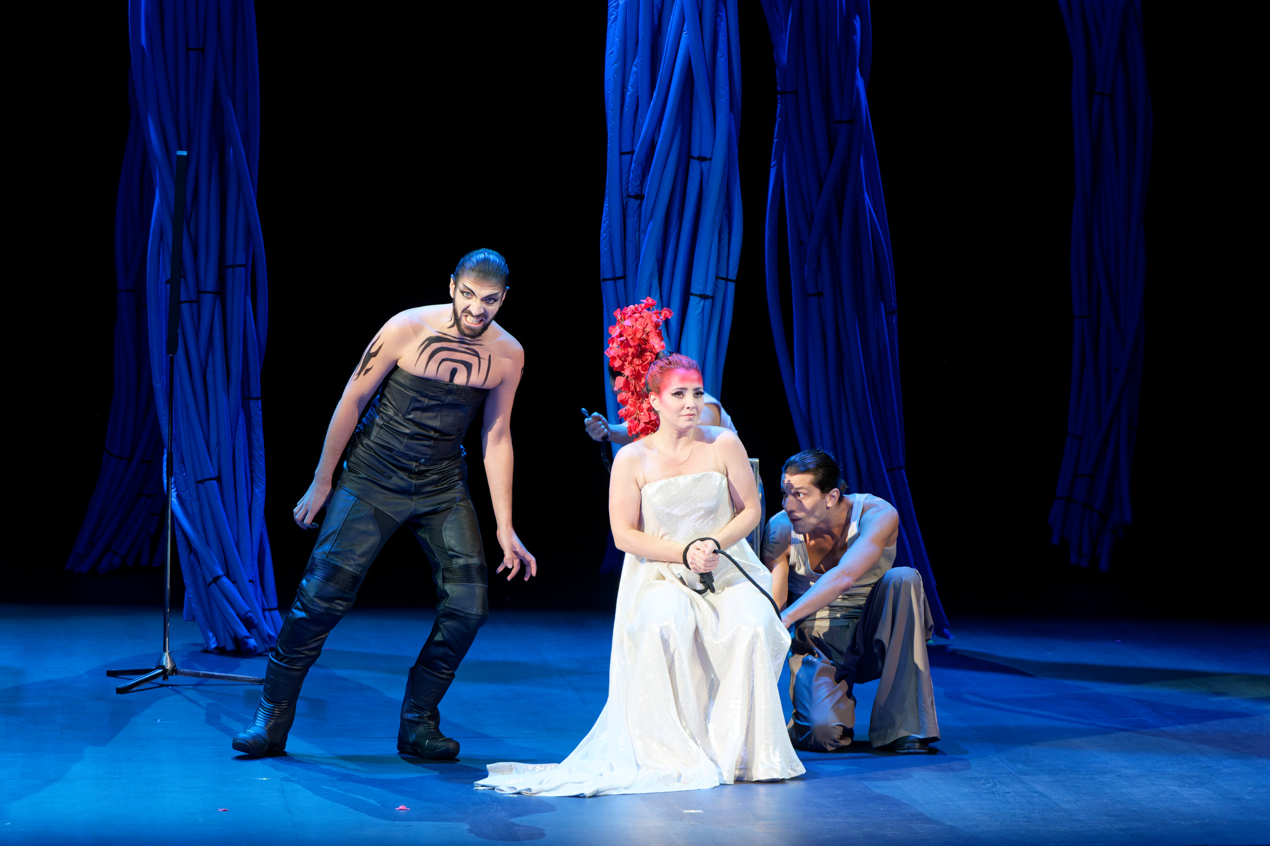 Léo Vermot-Desroches dessine un Tamino héroïque, presque wagnérien face à la Pamina de Norma Nahoun, jusqu'au bout piquante et gracieuse. Un peu comme son Sprecher, encore un peu vert (Joé Bertili), ses Prêtres et ses Hommes en armes (Denis Boirayon et Corentin Backès), Luigi Di Donato a les graves de Sarastro mais étonnamment pas l'étoffe, sa voix paraissant intimidée par les cascades de tissu immaculé dont les costumiers (Stéphane Rolland et Pierre Martinez) l'ont paré. Beaucoup plus à l'aise, les trois dames (Camille Poul, Reut Ventorero, Éléonore Gagey) s'emparent avec une volubile musicalité de leurs différentes apparitions. L'œil par trop rivé vers la fosse, les trois grands enfants maîtrisiens paraissent bien appliqués. Avec Yan Bua, malgré un second air de moindre assise, on gagne une incarnation qui nous épargne la tradition des Monostatos campés par des ténors dits de caractère. Il est rare que le couple Papageno/Papagena déçoive : cela se vérifie une nouvelle fois avec Chloé Jacob et Riccardo Novaro, ce dernier faisant monter très haut l'applaudimètre. Marlène Assayag rattrape un « O zittre nicht » un peu contraint d'un « Der Hölle Rache » exemplaire, accompagné avec beaucoup d'imagination par Giuseppe Grazioli et un Orchestre Saint-Étienne Loire plus mozartien (très beaux accents pour la scène des Hommes en armes) qu'il ne le fut in loco en juin dernier pour L'Enlèvement au sérail (subsistent quelques problèmes de justesse aux cordes, un cor en délicatesse sur la durée). Le chœur apparaît un peu moins soudé chez Mozart que dans le grand romantisme.