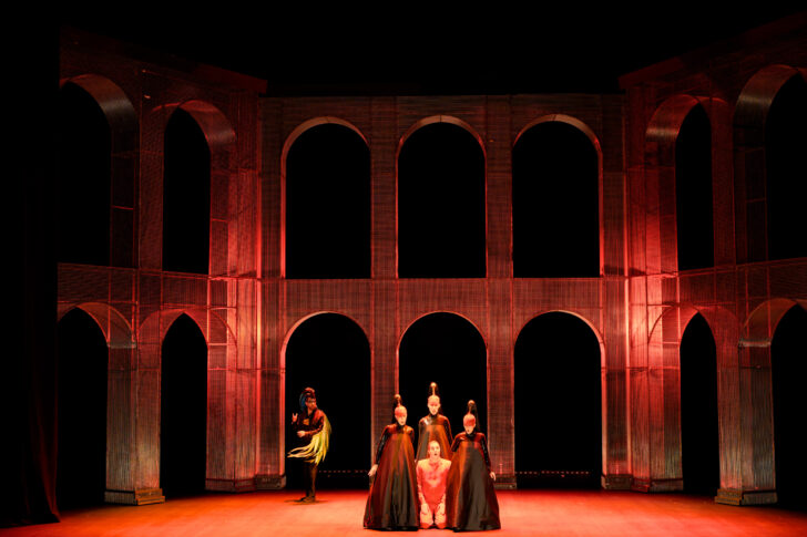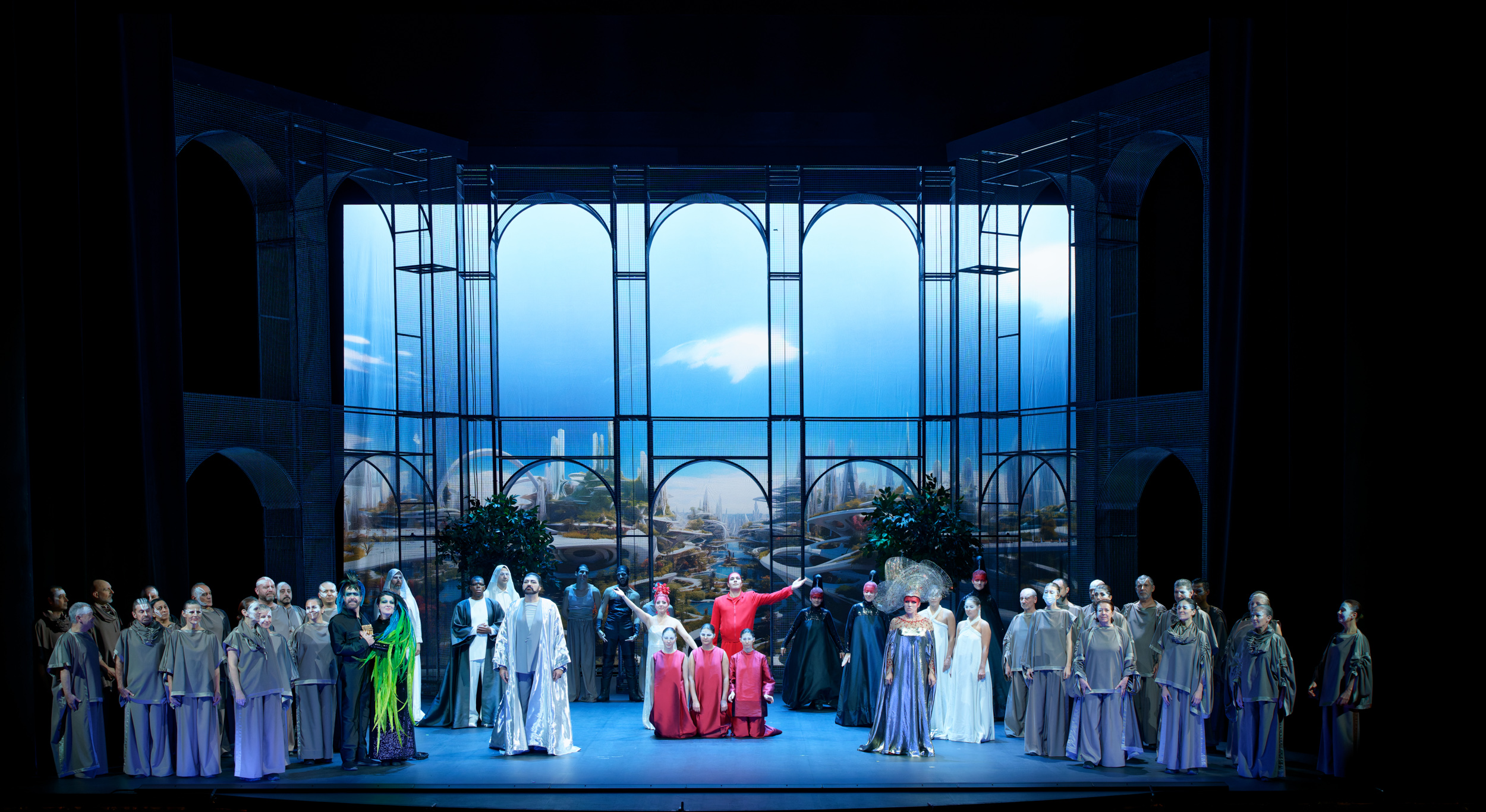 Le lever de rideau transporte le spectateur dans un univers qui a plus d' « un air de famille » avec l'ordinaire des maisons d'opéra des Trente Glorieuses, période qui était loin de l'être sur le plan des scénographies lyriques. Non, à l'opéra, ce n'était pas mieux avant, comme le rappelle à son insu le trio de troncs d'arbres bricolés par Clémence Bézat dans de la gaze sur un fond végétal : voilà pour le domaine sylvestre de la Reine de la Nuit, folle, nous apprend Sarastro, de « tisanes végétales ». Pour la grande bibliothèque de Sarastro, des silhouettes d'arcades translucides feront l'affaire. Le jeu d'orgues fait ce qu'il peut (surtout au deuxième acte, plus séduisant visuellement) pour masquer les limites esthétiques du dispositif de cette Flûte qui ne s'écarte jamais de son livret, jusqu'à une réconciliation finale où même Monostatos finit par trouver sa place dans la ville idéale végétalisée apparue sur les dernières mesures.