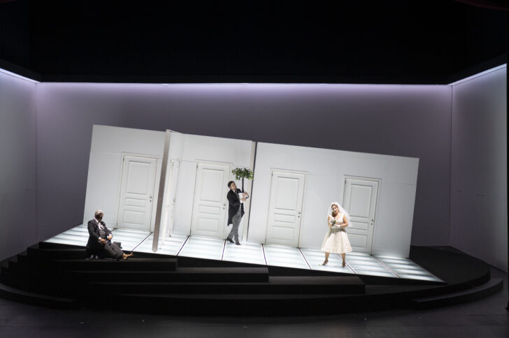 Le metteur en scène Damiano Michieletto entend assurer au spectacle un rythme rapide et surprenant, parfait écho des rebondissements imprévisibles de l'action, à la manière d'une Folle Journée fatto in Parigi. Sa conduite d'acteur rythmée mais fluide, incandescente mais drôle prend place au sein du décor unique de Paolo Fantin – plan incliné très modulable et placé sur le plateau central tournant : six murs amovibles et douze portes créent l'illusion d'une sorte de labyrinthe permanent, parfait pour l'enchainement de situations contrastées. On passe du cabinet de la modiste au salon d'apparat de la baronne ou de la salle de bain de Beaupertuis, le mari trompé, à la chambre nuptiale des futurs époux. L'aspect vaudevillesque est magnifié par ce rythme nerveux, cette pétulance sans repos et cette agitation permanente qui gagne même insidieusement les masses chorales – avec un désopilant tohu-bohu au gré du concert avorté chez la Baronne au deuxième acte.