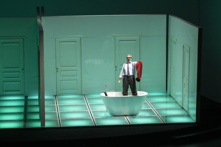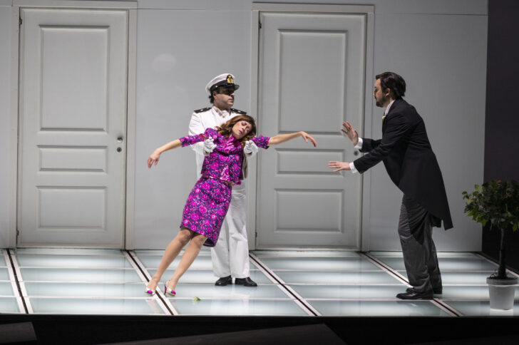 Aux costumes « classe et classiques » – différenciant bien personnages de la noblesse, de la bourgeoisie parisienne et des visiteurs venus de Province, signés Silvia Aymonino, répondent les éclairages inventifs et allusifs de Luciano Novelli : recombinant astucieusement par exemple au deuxième acte les couleurs du drapeau français dans le cabinet de la modiste ou au troisième celle du pavillon italien, entre lumière verte ambivalente, lit rouge de désir et blancheur virginale du décor, alors que le chœur entonne un claironnant Viva Italia.