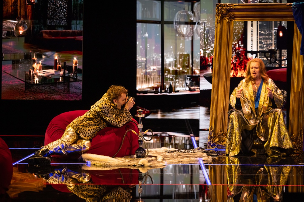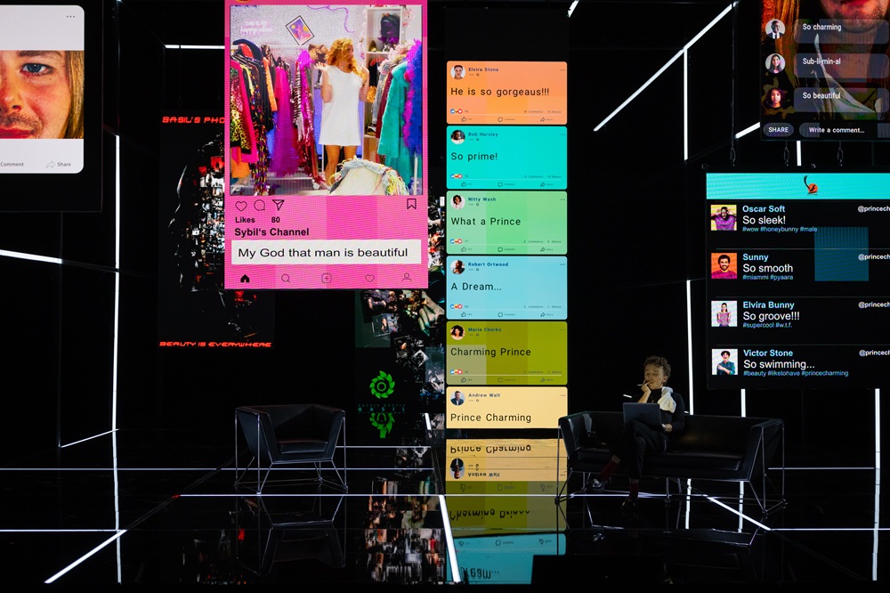 Portée par le flux des images et le débit des « Like » qui fusent sur l'écran, la mise en scène de est un spectacle permanent au rythme soutenu où les espaces se démultiplient tout comme le nuancier des couleurs sous les lumières très léchées de Fabrice Kebour. De larges panneaux descendent des cintres (Dorota Karolczak) qui se renouvèlent à l'envi dans un premier acte d'une grande vitalité. Ils servent également de support à la vidéo (David Haneke), avec cette ambivalence toujours entretenue entre réel et virtuel, live et enregistrement, quand on voit sur l'écran Sibyl en train de chanter ou lorsque les voix du chœur, invisible, nous parviennent des haut-parleurs. Deux percussionnistes perchés dans les étages nourrissent de même l'illusion d'une source électroacoustique potentielle. Au bénéfice d'un entracte, le décor luxuriant, au début de la deuxième partie, nous transporte au Moyen-Orient (ou plus loin encore) avec force dorures, couleurs chatoyantes et attitudes lascives des corps ; sur scène un joueur de oud et un danseur, concession distanciée au ballet de l'opéra romantique avec un clin d'œil malicieux à Strauss – hautbois oblige – quand Dorian/Hérode lance à son danseur : « Tanz für mich, Salomé ».