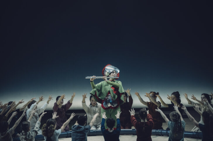 L'acte II, Evas Zweitgeburt, a été donné auparavant en janvier 2025 à Lille, de même que l'acte III. Il met tout d'abord en scène un chœur de jeunes filles (Mädchenprozession) déambulant dans de belles robes lumineuses vertes en forme de fleur. Elles chantent un hymne à Eva évoquant la féminité, l'érotisme et la symbolique de l'opéra Montag. Un pianiste à tête de perruche (Alphonse Cemin) vient alors féconder la statue d'Eva afin qu'elle donne naissance à des humains « plus harmonieux, plus beaux, plus musicaux ». Montag aus Licht contient des éléments autobiographiques, dont une allusion à la Seconde Guerre mondiale pendant laquelle Stockhausen a perdu ses deux parents, la mère du compositeur – atteinte de troubles mentaux – a été exécutée par les nazis et son père est mort au front. On peut cependant s'interroger sur la naïveté du propos aux accents eugénistes de cette phrase et du sens de cet acte en regard de la conclusion du premier. Les sept enfants – formidables solistes du Trinity Boys Choir (direction : Nicholas Mulroy) – chantent en compagnie de Mushi (Pia Davila-Chacon), avatar d'Eva. L'acte comporte aussi des numéros musicaux avec les personnages de Cœur de basset (Iris Zerdoud) et du duo Busi et Busa (Joséphine Besançon et Alice Caubit), dans lesquels les trois bassetistes doivent interpréter de mémoire une partition où musique et gestuelle sont extrêmement codifiées par Stockhausen.