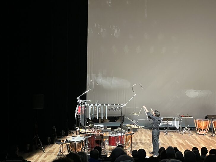 L'ample plateau du Palais des Congrès – dont les musiciens comme le public testent ce soir l'acoustique – est occupé à jardin par un rutilant set de percussions où dominent peaux et métaux. Dans Dust (autre référence à Beckett), une pièce qui s'inscrit dans le temps long (40 minutes), deux triangles géants surplombent la structure, que le percussionniste Morgan Laplace Mermoud met en mouvement et en résonance au début de l'œuvre. Dans Dust (Poussière), une pièce de 2017, l'interprète choisit son propre itinéraire, libre d'agencer à sa manière les huit modules qui constituent la partition. Clochettes, tiges de métal, ressorts, friction de l'archet sur les bords du tam sont autant de qualités de timbre explorées par la compositrice. Des instruments-signaux comme les triangles, le bol, la grosse cloche, semblent régler les étapes d'une cérémonie imaginaire. Aux instances lumineuses des métaux s'opposent l'impact mat des peaux souvent jouées à mains nues et le bourdon voluptueux de la superball passée sur la timbale. Morgan Laplace Mermoud vient sur le devant de la scène avec son bol tibétain dont la spirale sonore embrase l'espace. Plus sophistiquée encore est l'action de la plaque tonnerre faisant résonner par sympathie la caisse claire avec son timbre. Concentré et précis dans ses gestes et ses déplacements, Morgan Laplace Mermoud nous invite à une expérience d'écoute fascinante, entre matière et résonance, geste du performer et pouvoir de transcendance.