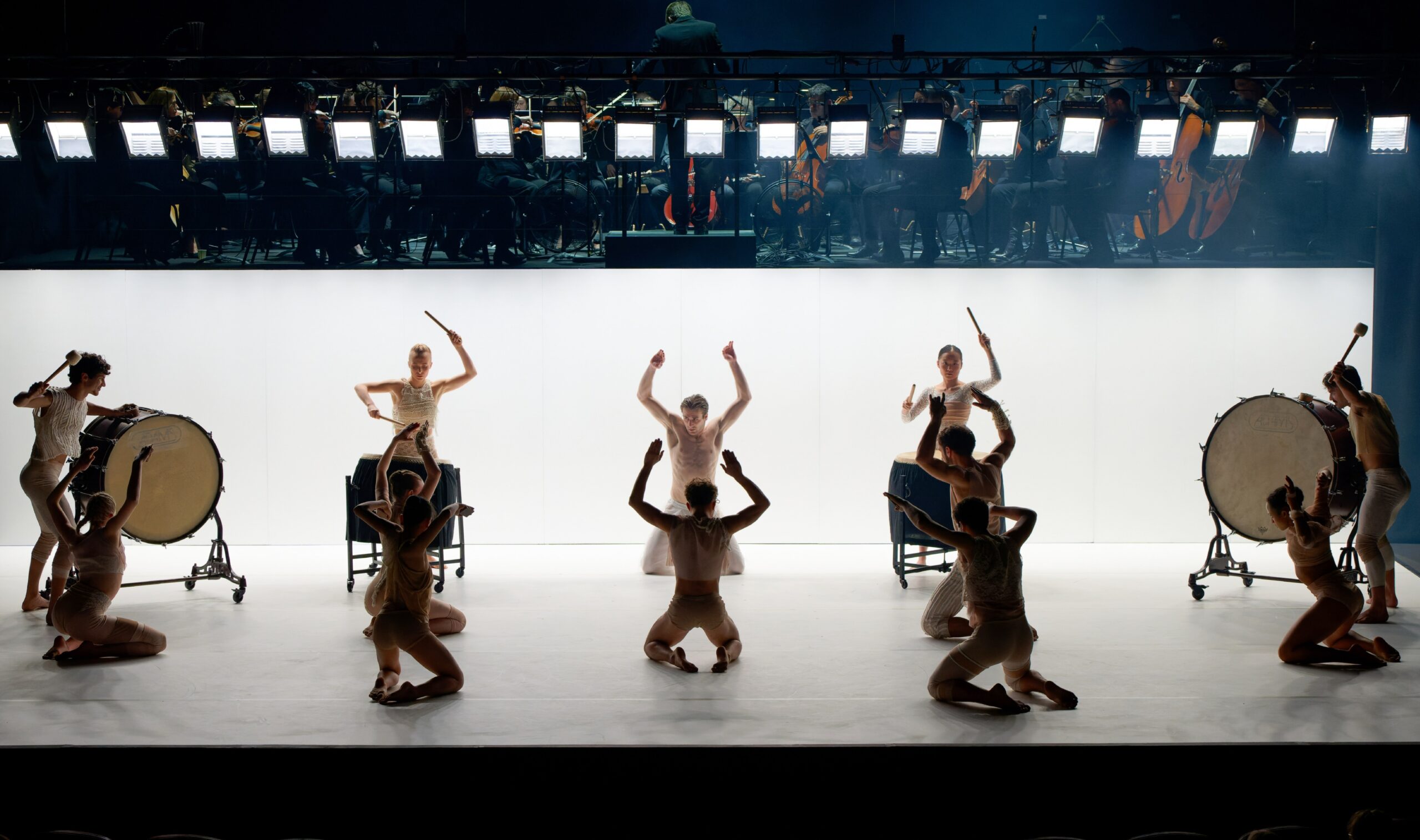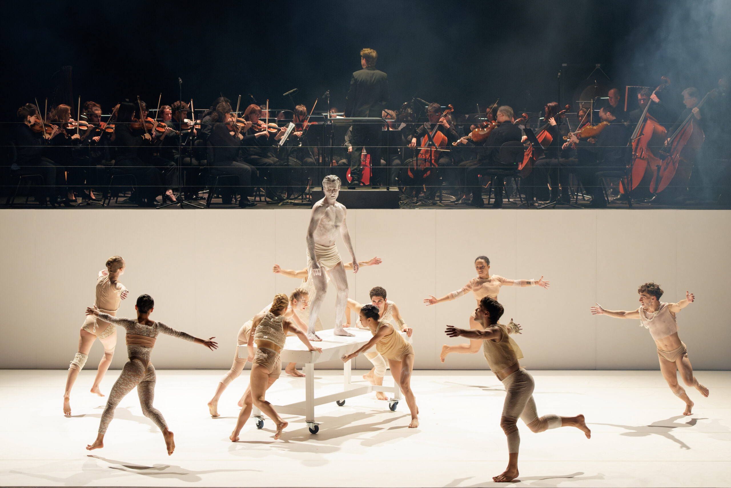 L'urgence qui caractérise son style fait mouche dès la première image d'un spectacle qui ambitionne de réunir toutes les forces de la maison avignonnaise. D'abord son orchestre, juché dans le noir en contre haut d'un plateau d'une blancheur immaculée. Les premiers accords de l'Ouverture font très vite place au silence. Sous une triple rangée de néons précipitamment abaissée des cintres, on assiste à la création, à partir de deux corps inertes sur des tables-brancards, de l'Humanité. Bras et jambes pliés sans ménagement, corps retournés comme des crêpes… la séquence, assez longue et non dénuée d'humour, pointe la grande malléabilité humaine. Et bien sûr, mis en valeur par les très beaux “lambeaux” de costumes de Mieke Kockelkorn, celle des membres (à tous les sens du terme) du ballet, visiblement galvanisés par l'art d'un chorégraphe qu'ils ont choisi eux-mêmes au terme d'un processus démocratique pas si fréquent.