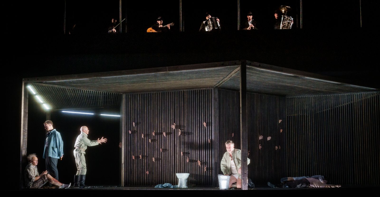 Pour revenir brièvement sur le dispositif scénique (Caroline Staunton), celui-ci consiste en un décor de panneaux de bois (Martin Zehetgruber) d'abord resserré à un petit cadre au centre de la scène – Acte I -, puis ouvert sur un système rotatif – Acte II – ensuite supprimé au profit d'un plateau nu – Acte III -, sur lequel les lumières (Olaf Freese) maintiennent continûment une sombre clarté. Par ailleurs, on regrette qu'après de nombreuses reprises, les éléments les moins efficaces n'aient pu être remis en cause, à commencer par les six musiciens de la fanfare, placés de face au-dessus de la scène sans la possibilité de créer vraiment l'atmosphère de fête populaire à l'acte II. Plus problématique encore, le Tambourmajor est toujours affublé d'un costume (Silke Willrett, Marc Weeger) de muscles en mousse, aussi ridicule qu'inadapté, dont on voit grossièrement la fermeture éclair noire dans le dos.