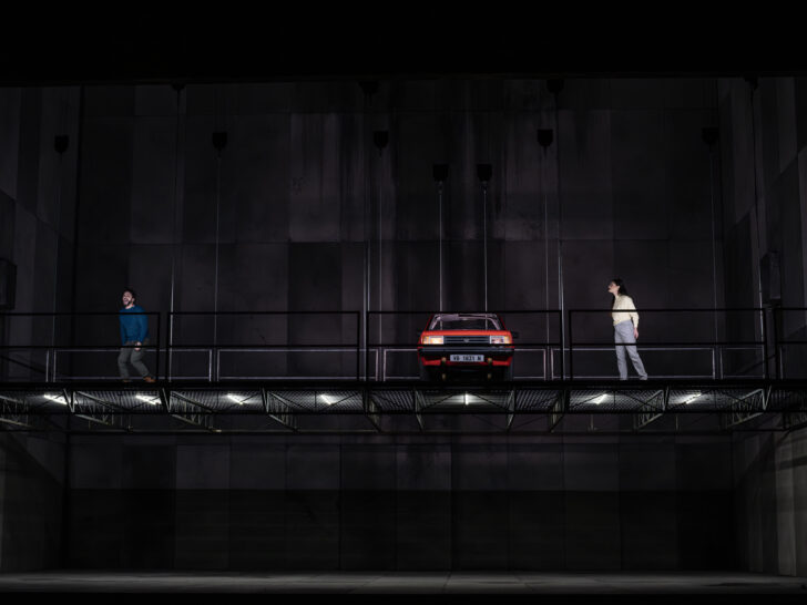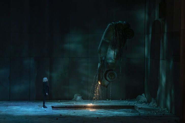 Un surréalisme d'échelle industrielle est atteint quand les invocations à Irminsul deviennent un culte à la « déesse voiture« – dans un rapport quasi fétichiste du féminin à la tôle qui, moyennant quelques modèles d'occasion bien datés et peu luxueux, n'est pas sans rappeler la très controversée Palme d'or cannoise 2021 Titane, autre évidente analogie cinématographique de Coppens ! C'est ainsi toute la dimension sacrée de l'ouvrage qui est envoyée à la casse par ce monstrueux tuning organique ! Voir descendre des cintres une grotesque carcasse automobile dandinante au son du Casta Diva offre un moment de décalage presque involontairement comique. Plus loin, c'est une compression alla César qui vient clore l'Acte I en fondant de même sur le trio Pollione-Adalgisa-Norma, avant que le bûcher final soit réduit à l'incendie commandité d'une bagnole de fortune où le couple maudit Norma-Pollione finit séquestré…