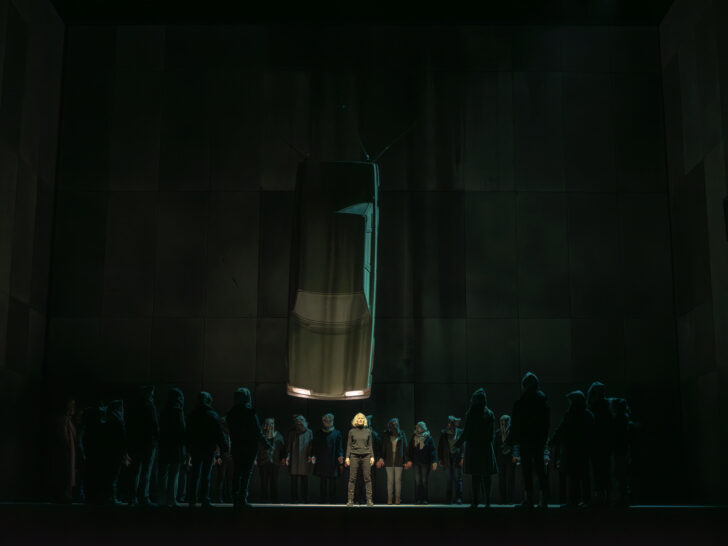 Le spectacle s'enlise dans une mise en scène que l'on qualifiera, au mieux, de brutaliste, au pire d'absconse. Coppens a choisi d'immerger le drame dans ses propres décors, hideusement bétonnés, sorte de « non-lieu » tenant tour à tour du parking, du sous-sol d'immeuble ou de la gare suburbaine d'une tristesse infinie, ou même, à l'orée de l'Acte II, d'un train d'une saleté répugnante, évoluant dans un environnement vidéo neigeux, puis incendiaire, apocalyptique. On se croirait souvent projeté dans une version lyrique de Rue Barbare ou de New York 1997, où le monde démocratique s'est estompé pour laisser place à un terrain de jeux pour factions violentes en pleine zone de non-droit. Cette vision, loin d'éclairer le texte, semble l'étouffer sous une chape de grisaille, vidant l'œuvre de sa sève tragique et de sa poésie pastorale druidique originelle. D'ailleurs les costumes évoluent entre tenues paramilitaires, ou vêtements a minima uniment sombres et quelconques, juste dignes de groupe de casseurs ou de sous-prolétaires désœuvrés.