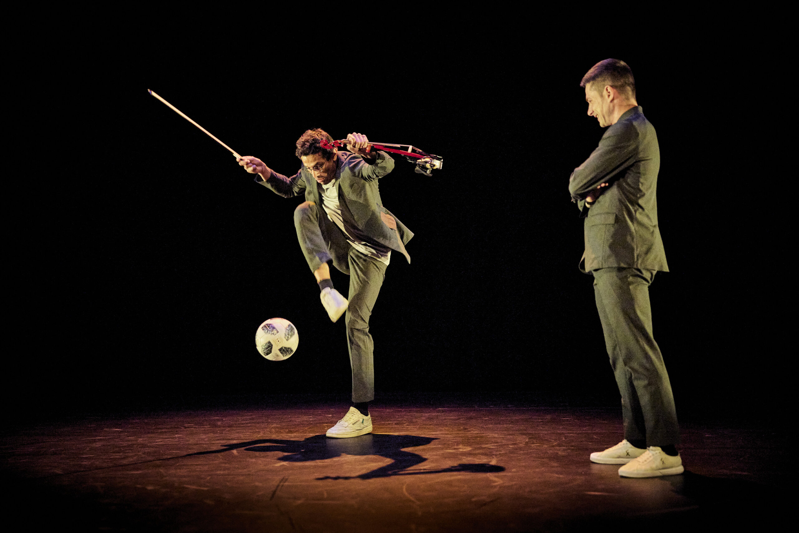 En costume cintré, comme les joueurs de l'équipe de France de football, les deux interprètes entament un fascinant dialogue en musique autour du ballon. La complicité et l'échange est malicieux et rapide entre les deux interprètes qui se jaugent, se testent et se mesurent l'un après l'autre. L'archet passe ainsi de main en main, le ballon fait un petit tour sur l'épaule du violoniste, et chacun retrouve finalement son instrument, bien content !