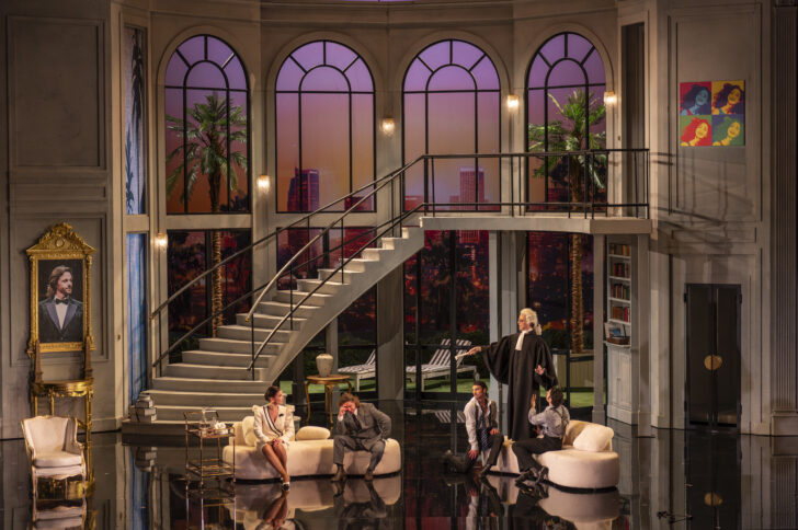 Tout change au deuxième acte (malgré la permanence de cet escalier perdu entre rez-de-chaussée et mezzanine) dans un univers cette fois « tridimensionnel » et nocturne tout de strass et paillettes où l'ambiguïté de genre est reine. Le Prince Orlofsky, rôle travesti par excellence, est ici mué en milliardaire producteur de films et trône sous des enseignes lumineuses à sa seule gloire — au jeu des lettres on croit deviner les anagrammes subliminales Rocky ou Forsythe. Surgissent immédiatement les ombres des affaires Weinstein ou Epstein : une meute de starlettes côtoie des Drag Queens délurées, dont l'irrésistible Ivan de Creatine Price, visuellement inspirée de la célèbre Divine. L'arrivisme et la quête du plaisir jouent ici toute l'ambiguïté de l'être et du paraître, sans jamais tomber dans le glauque ou l'obscène. Tout se joue à fleuret moucheté : une donne où le pataud Eisenstein est vite démasqué, littéralement « vampé » par sa propre épouse mutée en improbable… Catwoman.