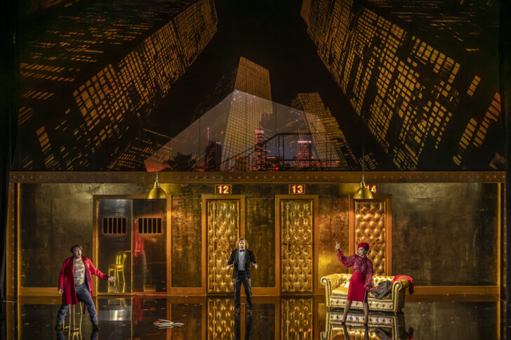 Le décor initial (un penthouse anonyme hyper-léché, délicieusement kitsch et classy très Dynasty) n'est pas sans rappeler, mutatis mutandis, le dispositif imaginé par Christophe Coppens pour sa Turandot « made in Hong Kong » vue à la Monnaie voici dix-huit mois. On y retrouve cette même disposition sur deux niveaux, signant les faux-semblants entre maîtres et valets. Ce soir, c'est Adèle (et non Liù) qui y rêve de grandeur, là où « Rosy » — Turandot de pacotille — batifole avec un Alfred aux faux airs de Calaf (beuglant non Nessun dorma mais les « tubes » de Queen ou des Pet Shop Boys pour séduire…) aux appétits gastronomiques et charnels disproportionnés. S'y ajoutent çà et là des emprunts télévisuels : tel le pardessus élimé de Frank façon Columbo ou le départ pour la case prison du même Alfred rappelant les Miami Vice et autres Starsky et Hutch.