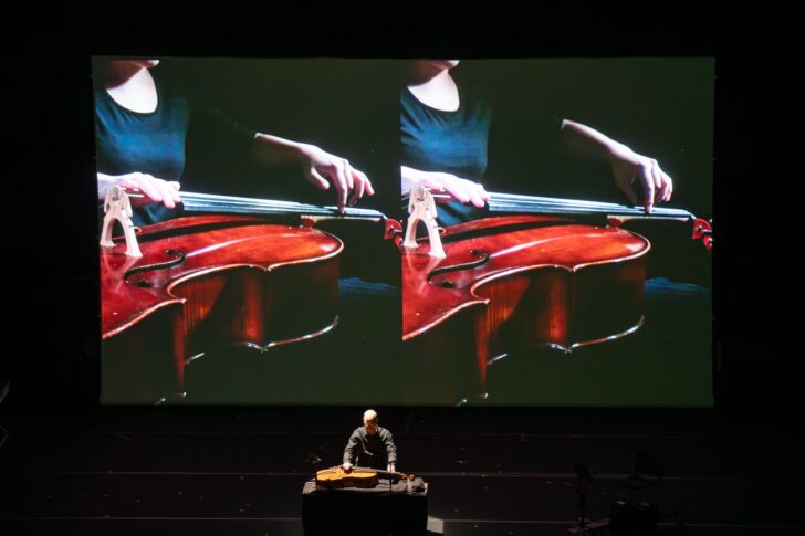 L'image reproduit et décline les gestes très spécifiques (sons glissés) des mains sur les cordes, la partie électronique n'ayant ici qu'un rôle décoratif. Lorsque, dans la seconde partie, Renaud Déjardin reprend son instrument à la verticale, la prestation, virtuose certes, éblouit sans toutefois nourrir le projet initial.