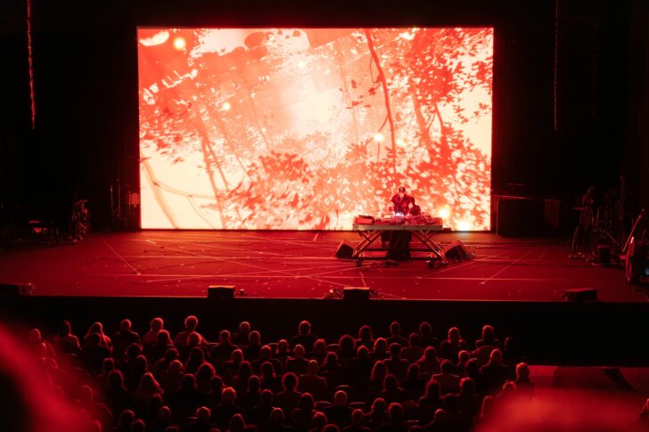 L'entrée en matière est explosive avec Ars natura, la performance audiovisuelle du duo Annabelle Playe et Hugo Arcier. Annabelle Playe est une artiste pluridisciplinaire qui chante, écrit et compose. Devant son set électronique − samplers, synthétiseurs numériques et modulaires, etc. − elle mixe ce soir dans la pénombre traversée des éclats lumineux du diadème qui rehausse sa coiffure : le geste est puissant, entre déflagrations et déchirements, lissage et distorsion d'un flux sonore à haute tension qui ménage cependant de grandes respirations en lien avec la vidéo d'Hugo Arcier. Des images somptueuses en 3D (réelles ou factices) donnent à voir une nature dense et sauvage, privée de toute présence humaine : fantasmagories arborescentes, dominantes de rouge feu, ou paysage liminal, troncs et branches dénudés, comme les arbres d'un Penone, que le vidéaste compose et assemble dans la seconde partie. L'œil comme l'oreille restent aux aguets à la faveur d'une interaction très réussie des deux sources en présence. Les fumigènes jouant avec les leds sur le plateau (création lumière de Rima Ben-Brahim) n'arrivent qu'à la fin, qui débordent le cadre de l'écran et ouvrent l'espace sur d'autres perspectives : sauvage autant que poétique !