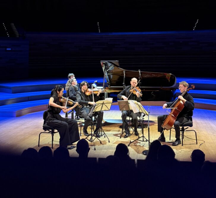 D'un climat bien différent le Quintette avec piano n°2 de Gabriel Fauré voit l'arrivée sur scène de la pianiste Marie-Ange Nguci, artiste en résidence à Radio France pour cette saison. Chef d'œuvre de la dernière période créatrice du compositeur, considéré comme un des sommets du catalogue fauréen, composé en 1920 par un musicien déjà lourdement handicapé par une surdité touchant essentiellement les aigus, il se caractérise par sa polyphonie dense et savante qui réunit dans une étroite symbiose piano et cordes associant dans un contrepoint d'une rare expressivité des cordes très effusives et un piano volubile. Il se décline en quatre mouvements : un Allegro moderato entamé par l'alto au timbre nostalgique qui ouvre la voie à une interprétation tendue et tourmentée ; plus fantasque le Scherzo suivant se teinte, quant à lui, d'un modernisme étonnant et malicieux par sa rythmique obsessionnelle où se conjuguent les traits vertigineux du piano et les pizzicati incisifs des cordes dans une véritable course à l'abime virtuose parfaitement mise en place ; plus apaisé l'Andante moderato retrouve un peu de sérénité après ce Scherzo endiablé pour laisser s'épancher l'émotion et la douleur dans une ample et poignante polyphonie, avant que l'Allegro final n'achève cette remarquable interprétation dans une cavalcade enjouée et virevoltante, réunissant des cordes et un piano flamboyants portés par un même élan jubilatoire.