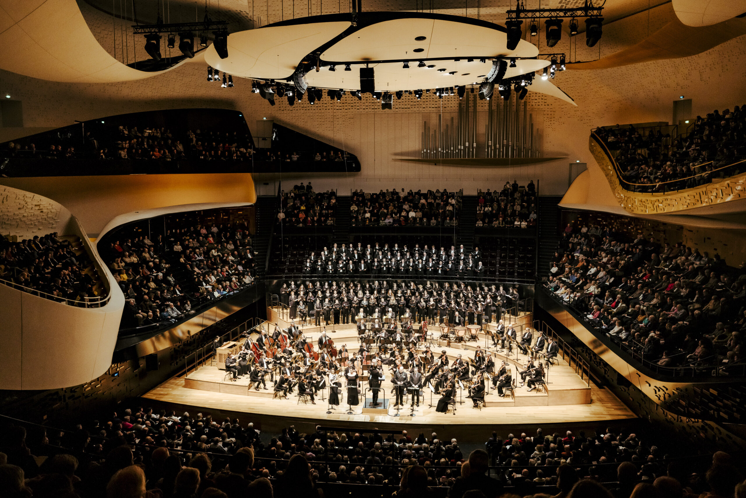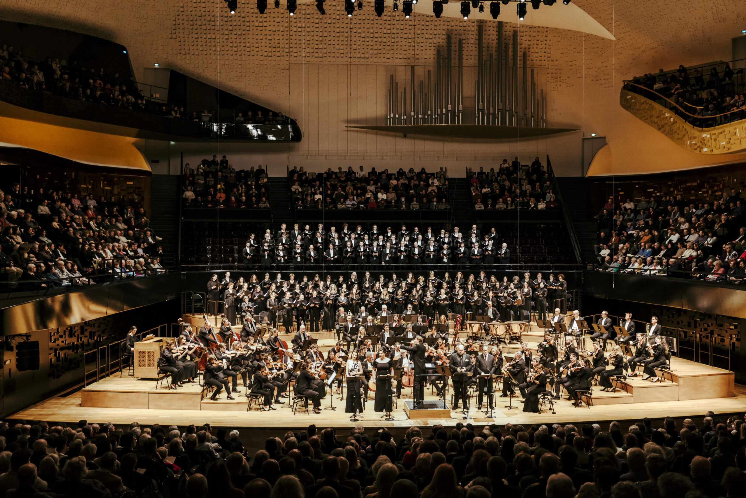 La fougue de Mäkelä s'accorde ensuite bien à l'effervescence du Gloria, particulièrement exalté encore par le chœur, aussi puissant en tutti que lorsque ses groupes se répondent. Les hommes sont environ soixante-dix sur les gradins en arrière scène, les femmes quatre-vingt sur la scène juste derrière l'orchestre, dans un étagement qui fonctionne notamment par le fait que les basses sont souvent renforcées dans leur puissance par leur placement en hauteur. Le ténor anglais relance le quatuor d'un timbre angélique en introduisant « Gratias agimus tibi », superbement relayé par la voix pleine de profondeur de la mezzo. Toute la soirée, l'excellence du quatuor vocal vient du fait qu'en plus de prononcer parfaitement chaque syllabe du texte latin, tous ses chanteurs possèdent une voix extrêmement pure, quasi dénuée de vibrato.