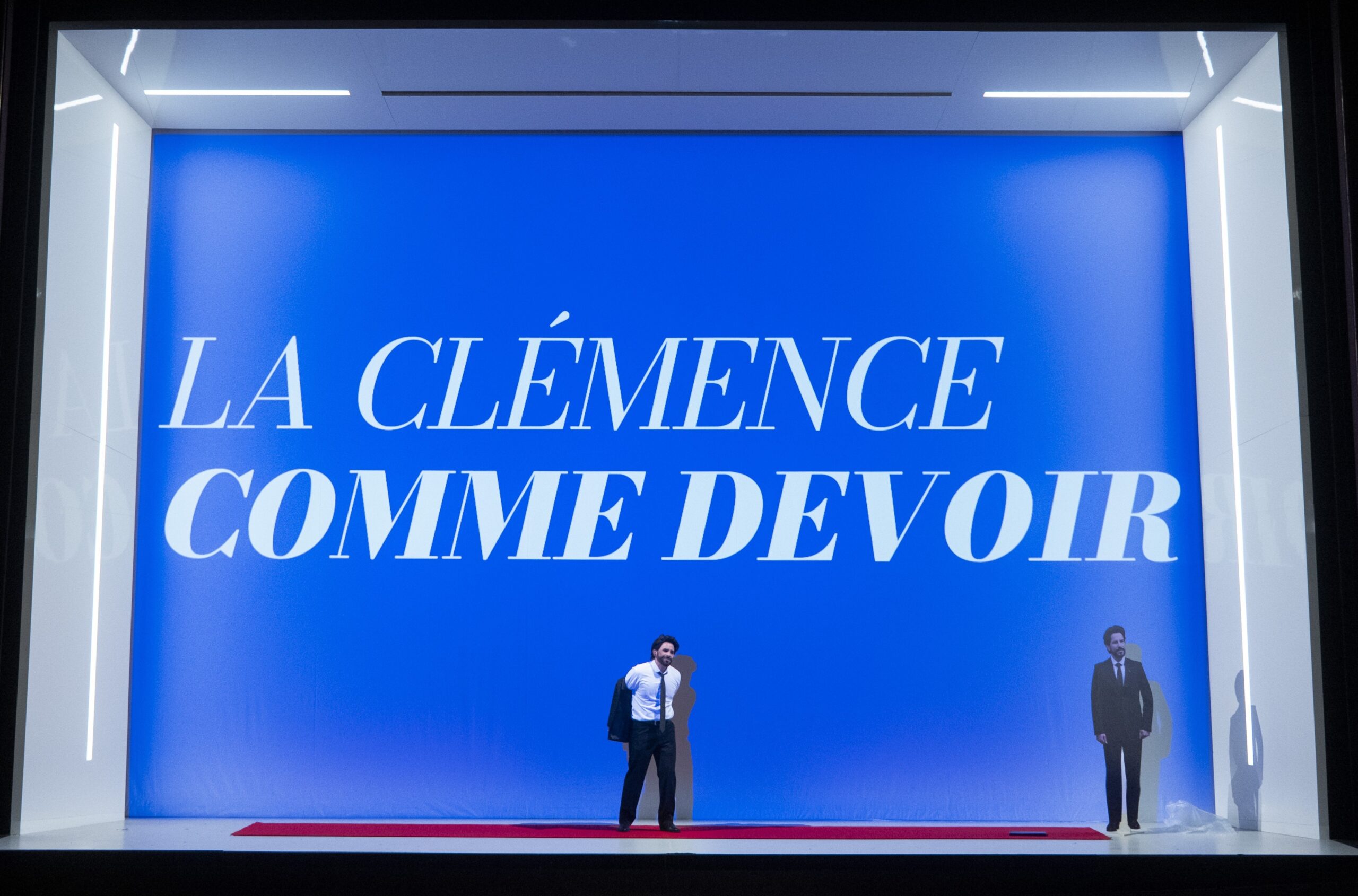 Titus est un homme bon. Denrée rare à l'opéra comme dans la vie. Décrit en son temps rien moins que comme « les délices du genre humain », le Titus bien contemporain du Lab est plus insaisissable : moqueur sous cape de la Marcia de l'Acte I chorégraphiée en danse provençale, joueur au moment de prendre la pose devant les photographes. Ce qui ne l'empêchera pas de donner réalité à « La Clémence, ensemble », « La Clémence comme devoir » ou « La Clémence au service du peuple», ses slogans de campagne, exhibés devant des spectateurs à qui on aura même remis à l'entrée en salle des badges griffés d'un simple « Titus ». Mais le doute subsistera : sincère sa clémence, ou manœuvre politique ?