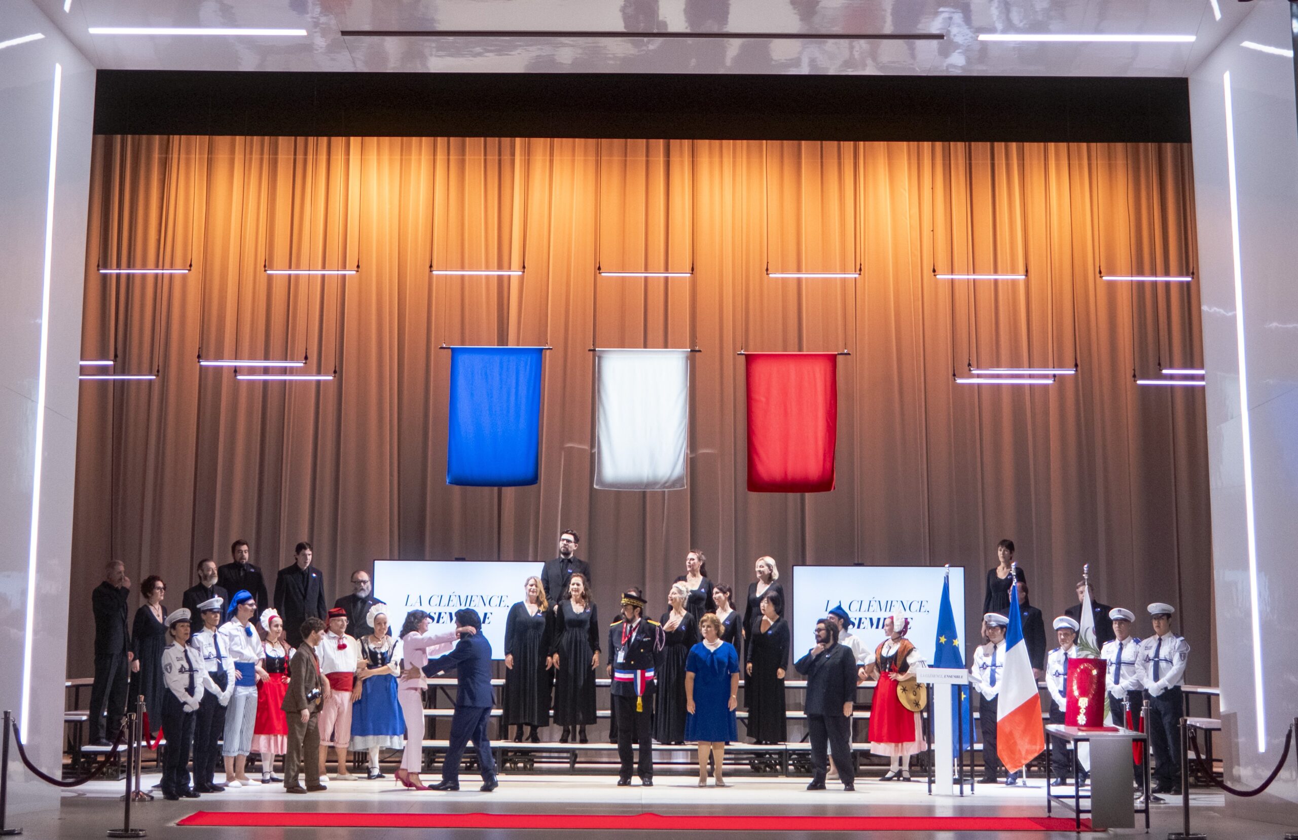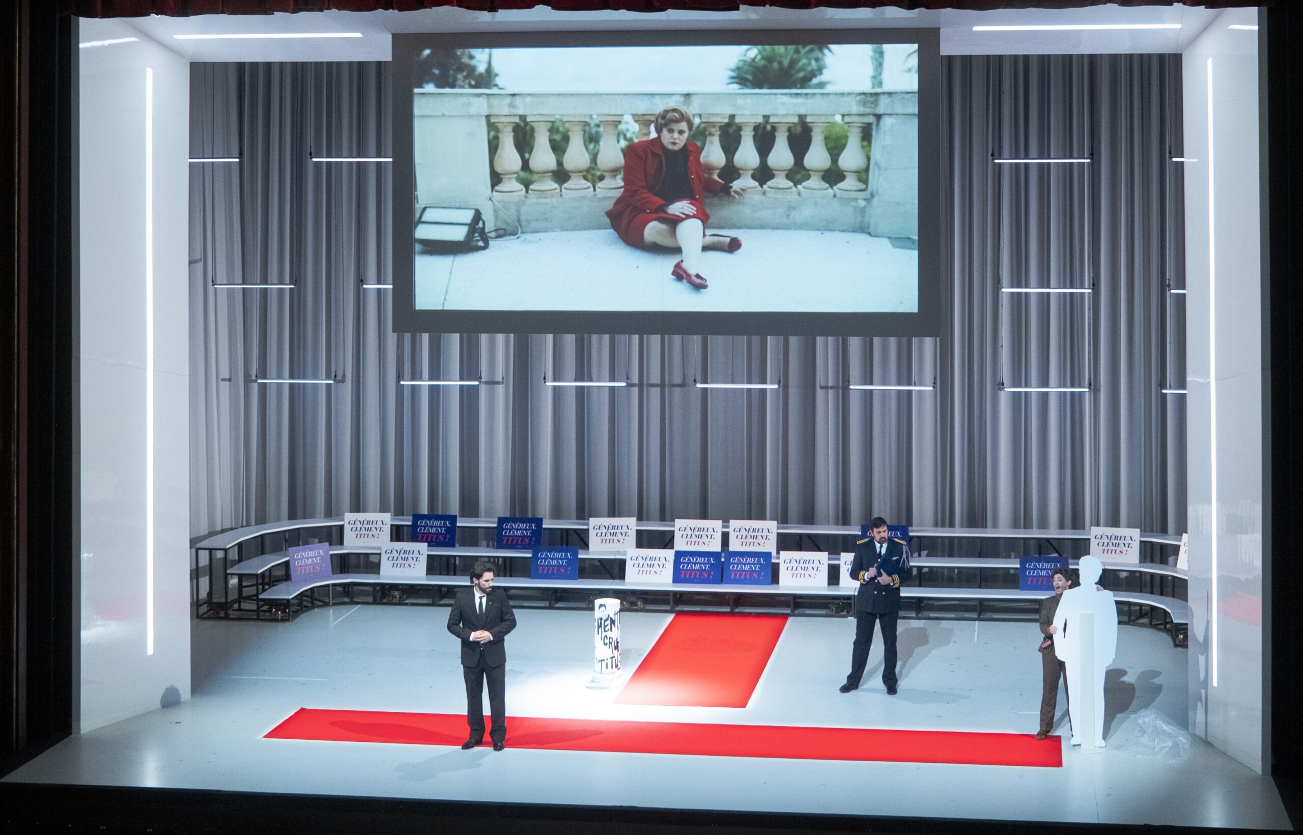 Le décor est toujours un personnage fascinant avec le Lab. Même d'une simplicité qu'on devine, avec ses gradins, et ses longs voilages fluides manipulés sans relâche autour d'un intérieur en plexiglas, servir d'écran de fumée à certaine austérité en vogue même sur les scènes lyriques, celui de La Clémence niçoise ne déroge pas à la règle avec son incrustation dans un très classieux cadre de scène pourvu d'un mur blanc coulissant pouvant servir de tract ou d'écran géants. La vidéo ne lâche quasiment pas d'une semelle Vitellia, même quand elle n'est pas censée être sur le plateau : véritable fil bleu blanc rouge (de ses robes à ses bouquets) du spectacle, on la verra en proie au doute, tentée par le suicide… A 180° de la Vitellia froidement calculatrice de Carsen à Salzbourg, qui utilisait la clémence impériale pour prendre le pouvoir, la Vitellia du Lab réalisera que la vraie vie est ailleurs…