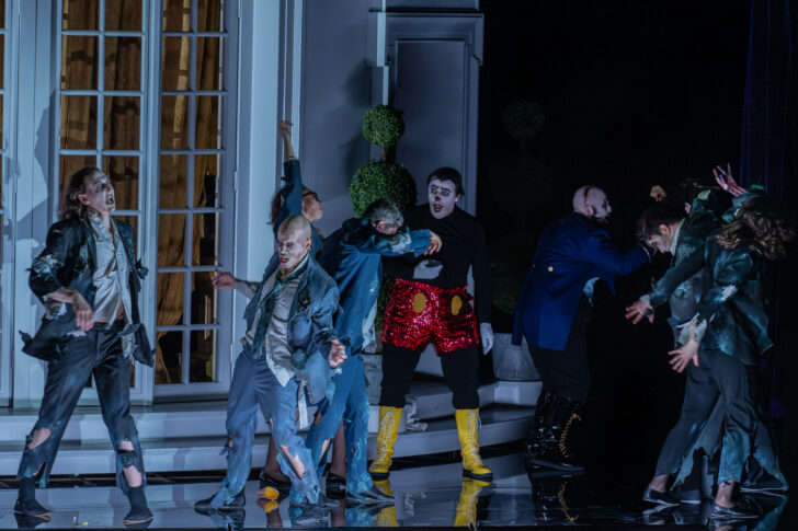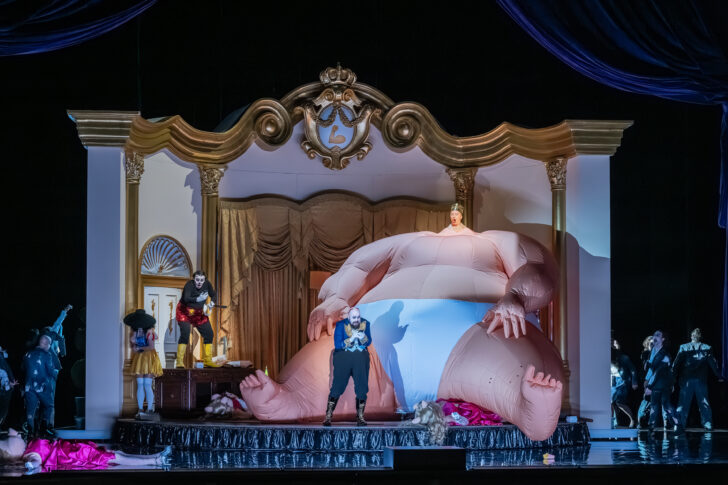 La mise en scène truculente de Tobias Kratzer balance entre fiction cinématographique et bouffonnerie ubuesque. Très drôle, dans le décor de la Maison blanche (tableau II), cette parodie d'America's Got Talent (émission de téléréalité américaine) où défilent sur l'avant-scène ménagée devant l'orchestre les stars de demain que le Roi-Président fait basculer dans le vide d'un coup de sonnette. Menacé par Miss Piguy et Kermit (alias les « vampirettes » déguisées en grenouille et en cochon), et avec les ressorts de la vidéo (virtuoses Jonas Dahl et Janic Bebi), le despote assied son invulnérabilité en décuplant de volume.